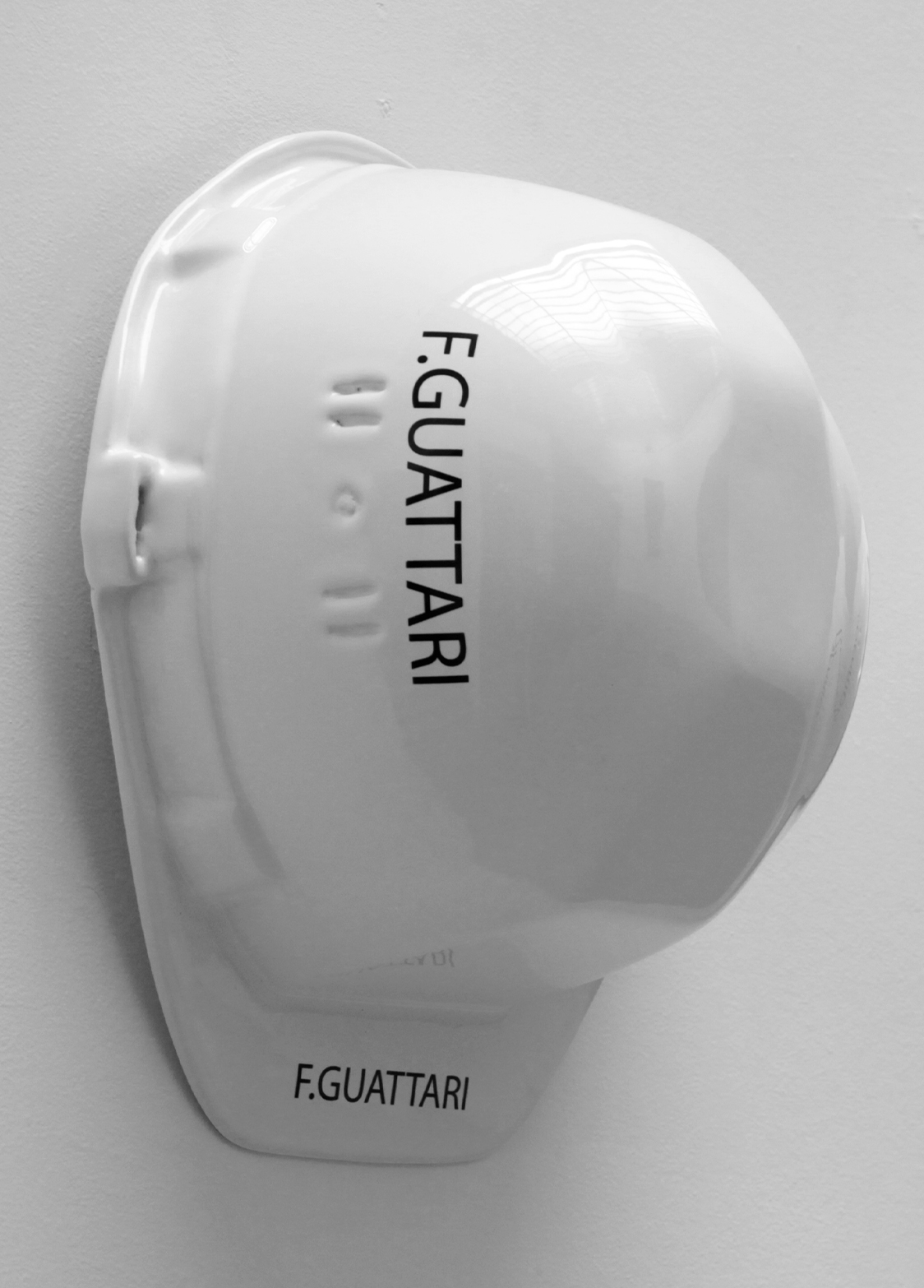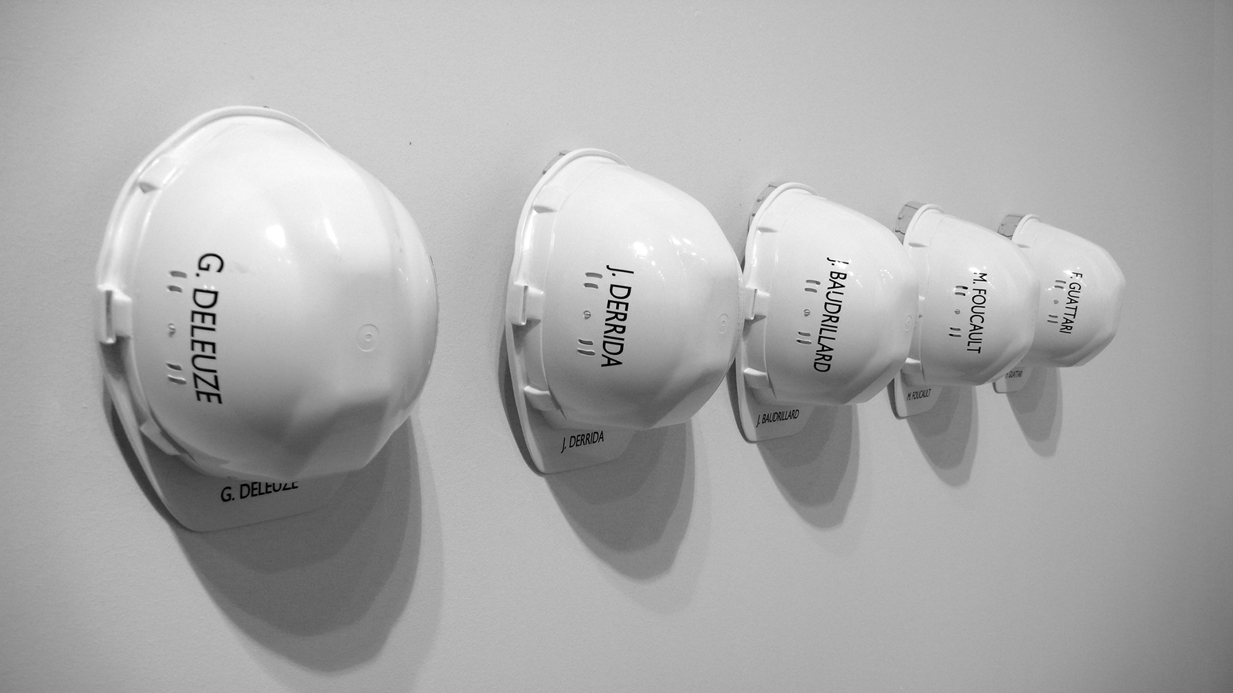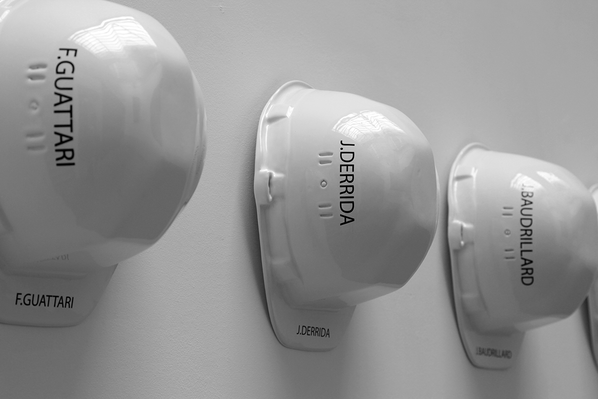 Their names inscribed on building site hard hats immediately suggest the notion of construction and at first sight provide a formal means to create a link with architecture, which goes beyond the notion of constructing a frame, creating a shift towards a way of formulating thought, its history and its connections. If thought is both a construction and construction material, systems of thought are built up into architecture, a different sort of architecture. The parallel between workman’s work and a piece of work that is constituted by the structuring of an idea, a theory or a political system is evident here.