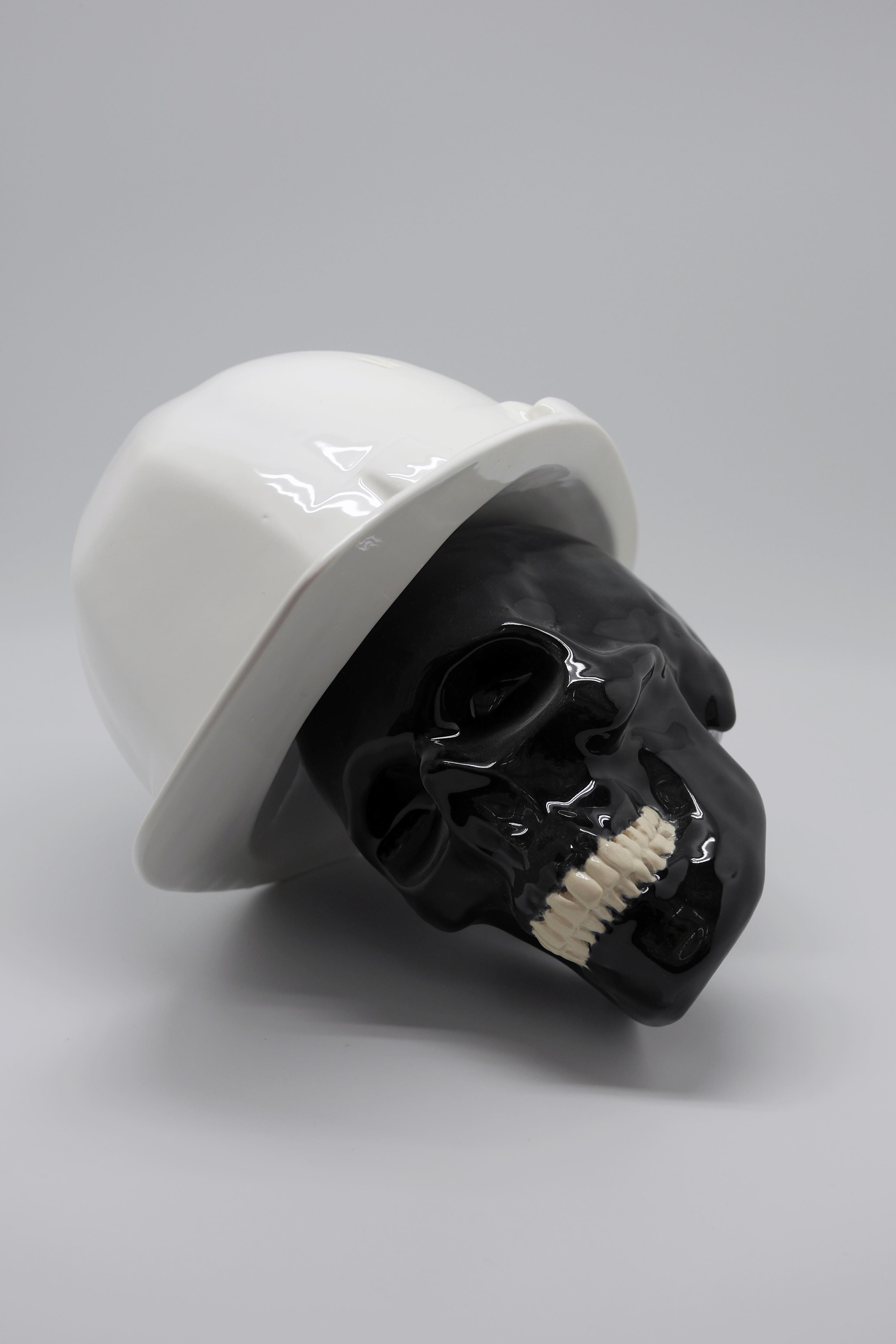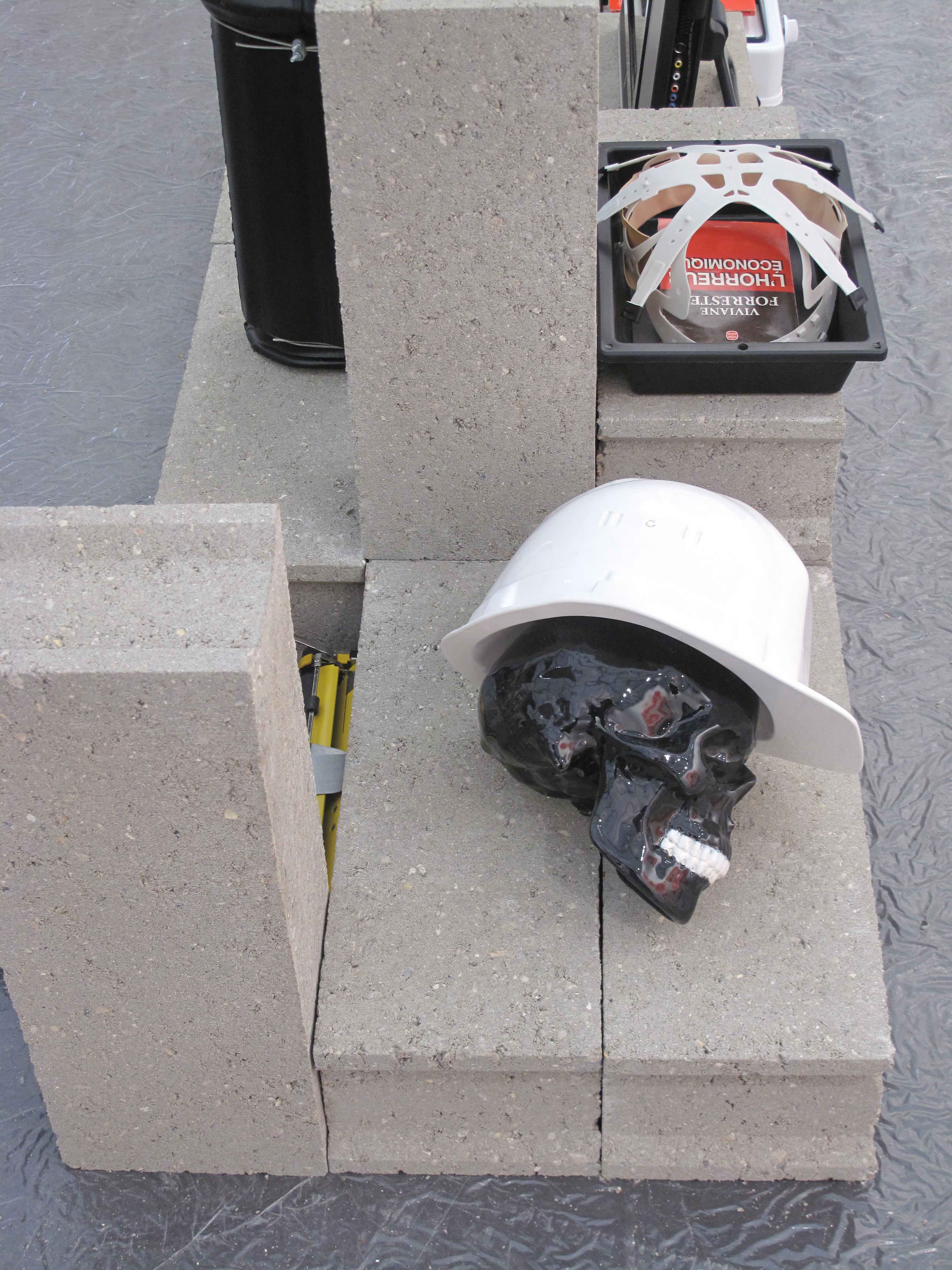 The installation functions as an abandoned, deserted building site, where the presence of death establishes a new angle of reflection. The artist has chosen fragile materials such as porcelain to create the skulls, as well as the hard hats that are meant to protect them. Everything is vulnerable. This paradox clearly demonstrates the fragility of thought as well as the architecture inspired by it. Everything is in the process of falling, an interminable fall. When the majority of theories, systems and ideological structures with which the contemporary world has been constructed are in crisis, what must be clung to and what must be completely forgotten?