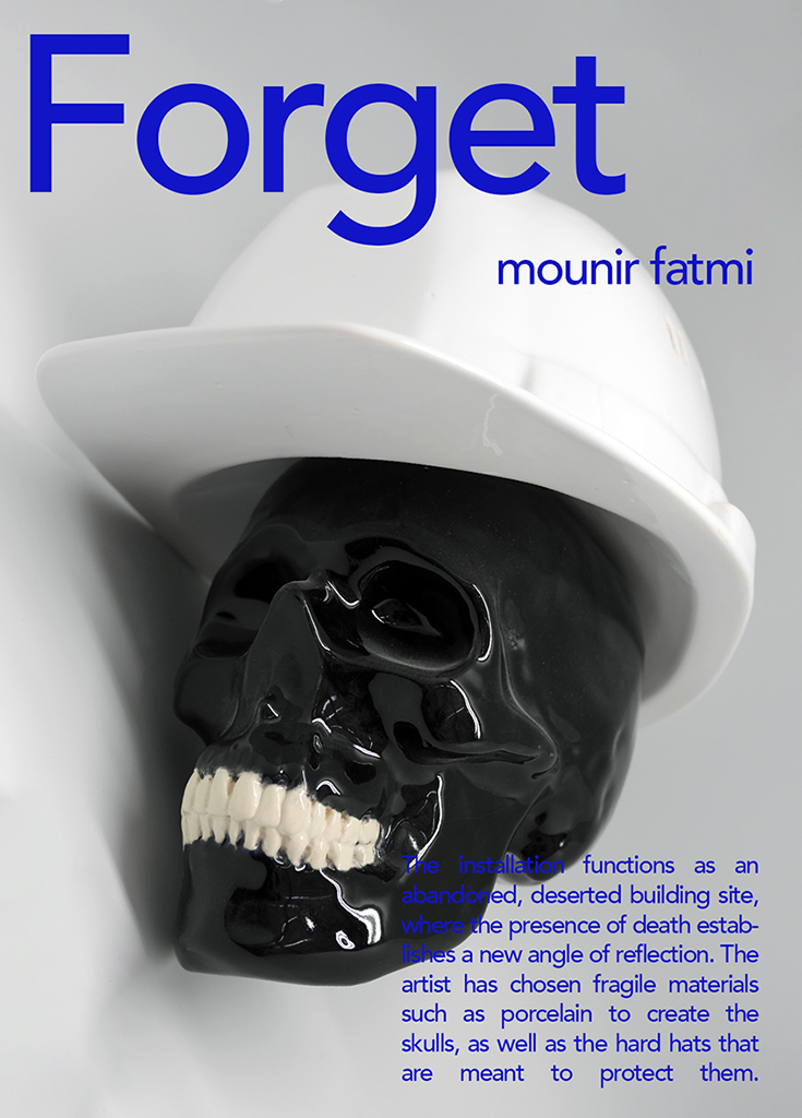L’installation fonctionne comme un chantier déserté, abandonné, où la mort s’est imposée comme un nouvel élément de réflexion. Dans cette proposition l’artiste a choisi des matériaux fragiles comme la porcelaine pour créer les crânes ainsi que les casques qui sont supposé les protéger. Tout est vulnérable. Ce paradoxe nous montre clairement la fragilité de la pensée ainsi que de l’architecture qui s’en inspire. Tout est en train de tomber, une chute interminable. Qu’est ce qu’il faut absolument oublier et à quoi il faut s’accrocher au moment où la plupart des théories, des systèmes, des structures idéologiques avec lesquels on a construit le monde contemporain sont en crise ?