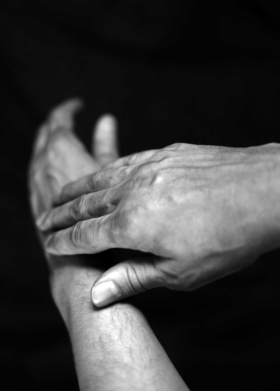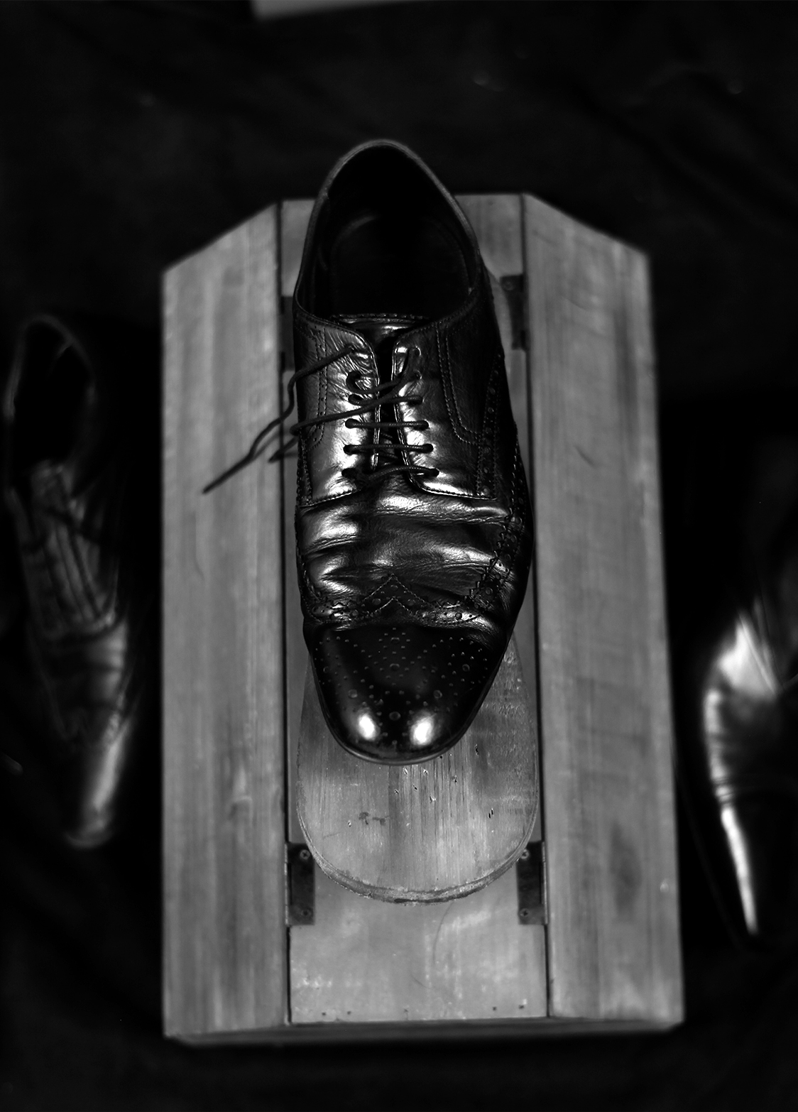 The photographs themselves are dark, closely cropped scenes of a man’s hands in the process of shining a shoe. They are set against a black background creating a feeling of isolation, anonymity; Images of the brush or a white shammy cloth rubbing along the sides of the black leather shoe; an image of the shoe itself on the raised box; a hand touching the black shoe polish; an image of hands rubbing together, the black polish seemingly making them darker.