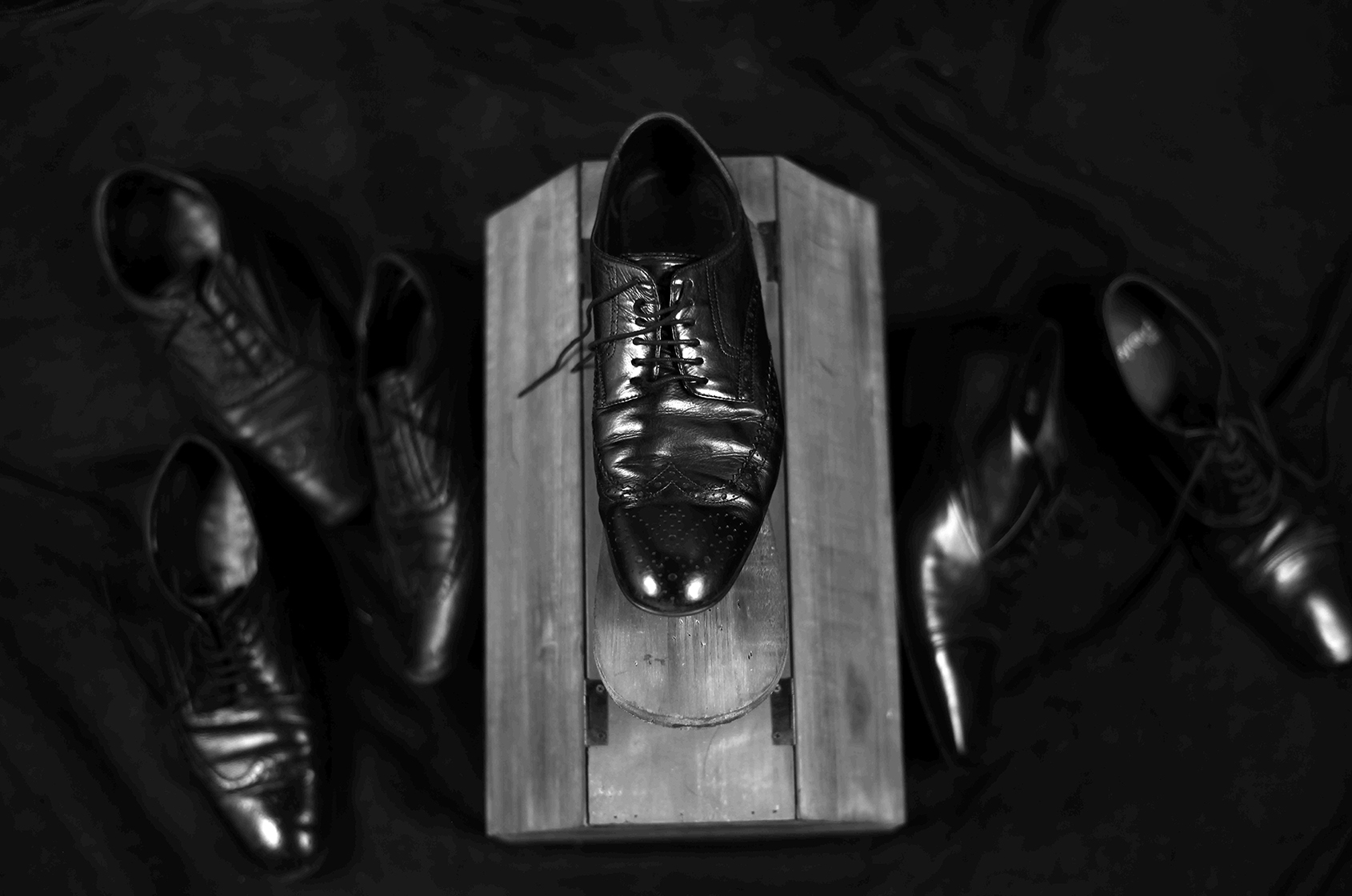 '' Darkening Process turns around a closely cropped scene in black and white that shows a pair of hands intensely polishing and scrubbing a pair of black leather shoes.
