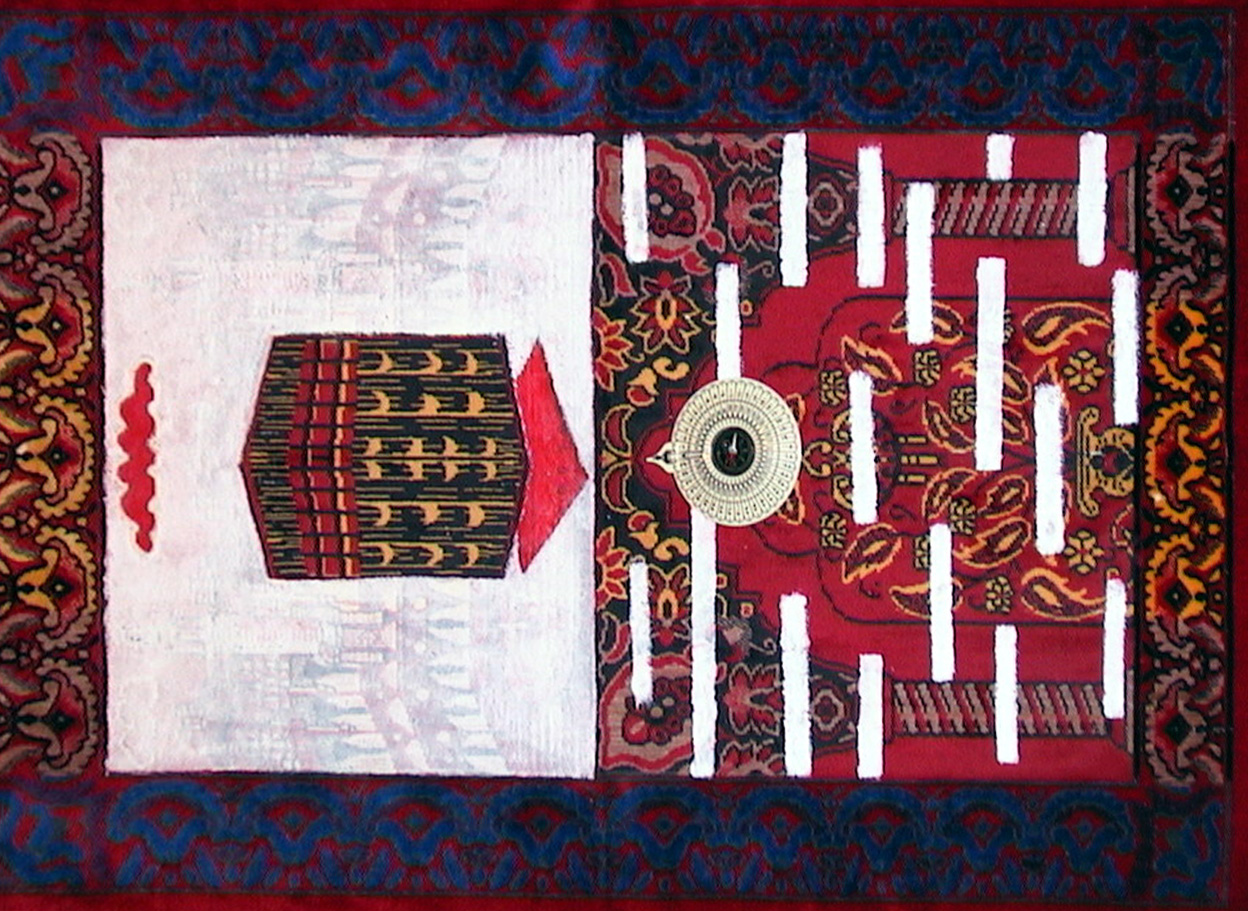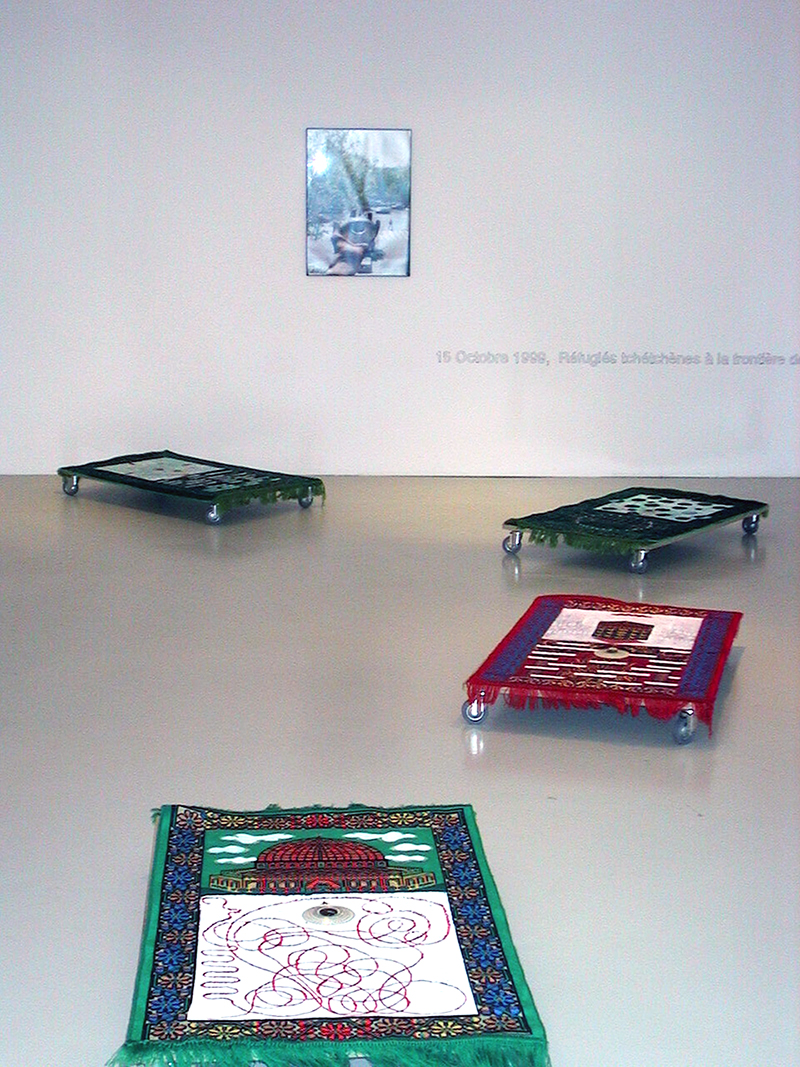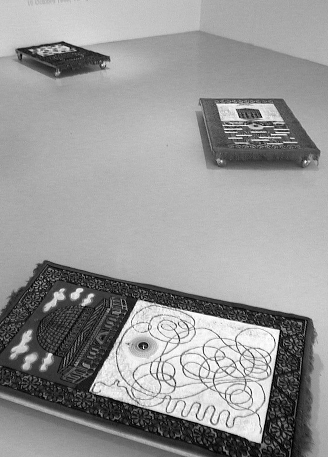 An installation created in 1999, Without a Place is the first project in a series of ready-mades using prayer rugs and compasses that indicate the direction to Mecca. The rugs are rolled out onto wood boards fitted with wheels that are disposed across the floor with various orientations. They have also been partly covered with white paint: in certain places, simple white lines are superimposed on their calligraphic motifs and partially mask them, sort of like the gesture of erasing or crossing out a text to remove certain passages. In other places, the paint completely covers the calligraphic motifs and the entire surface of the rug, with the exception of its figurative portions – which however aren’t completely figurative and tend towards abstract geometry as well, as they are representations of the cube of the Kaaba.