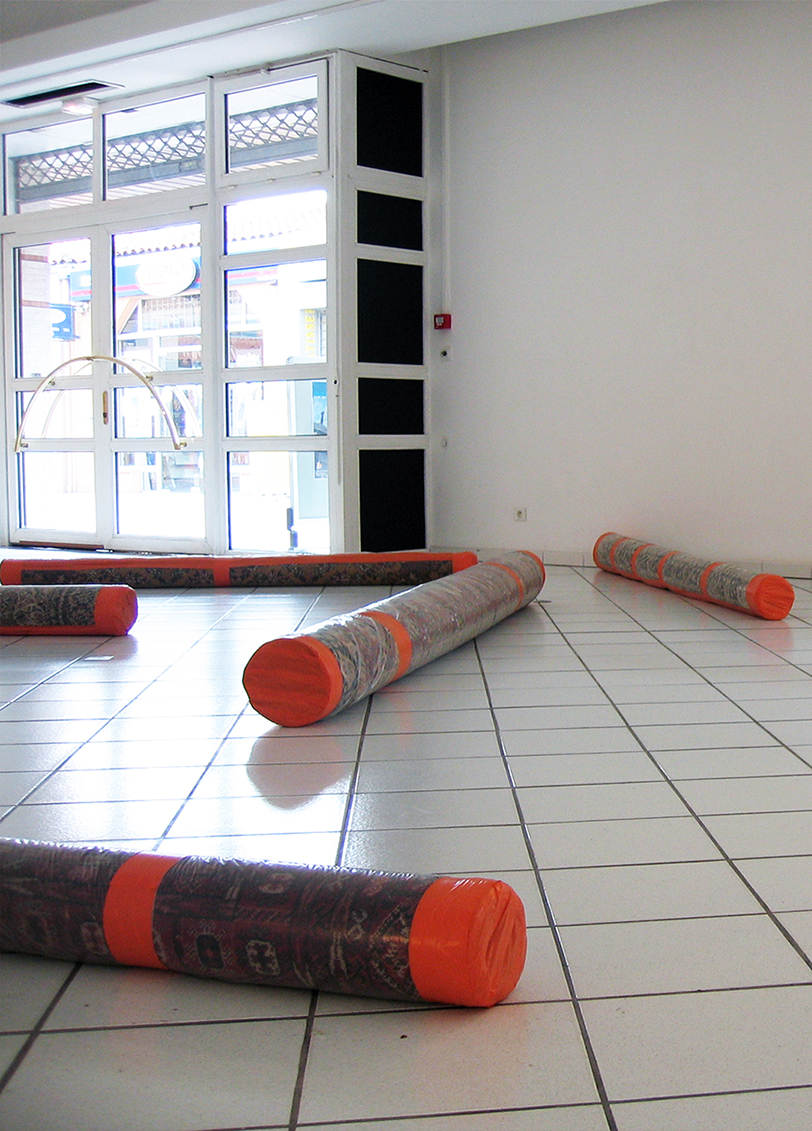The artwork shows an imprisonment. The rolled up carpets, their wrapping in plastic and random disposition on the floor represent the situation of abandonment and isolation of the countries affected by the sanction. The absence of communication between these countries and the outside world leads to the indifference of the international community regarding the fate of their populations. Embargo describes a state that is close to death. Time has stopped in the countries affected by the blockage and the tubes are, at best, suggestive of time capsules. The sanction has precipitated these societies into a state of slumber comparable to a coma, and getting out of it is more than uncertain. It’s hard to say whether the plastic covers serve as a protection or if they should be rather perceived as body bags. Artisanal production is halted and the interruption of the country’s economic activity brings it to a state close to death.