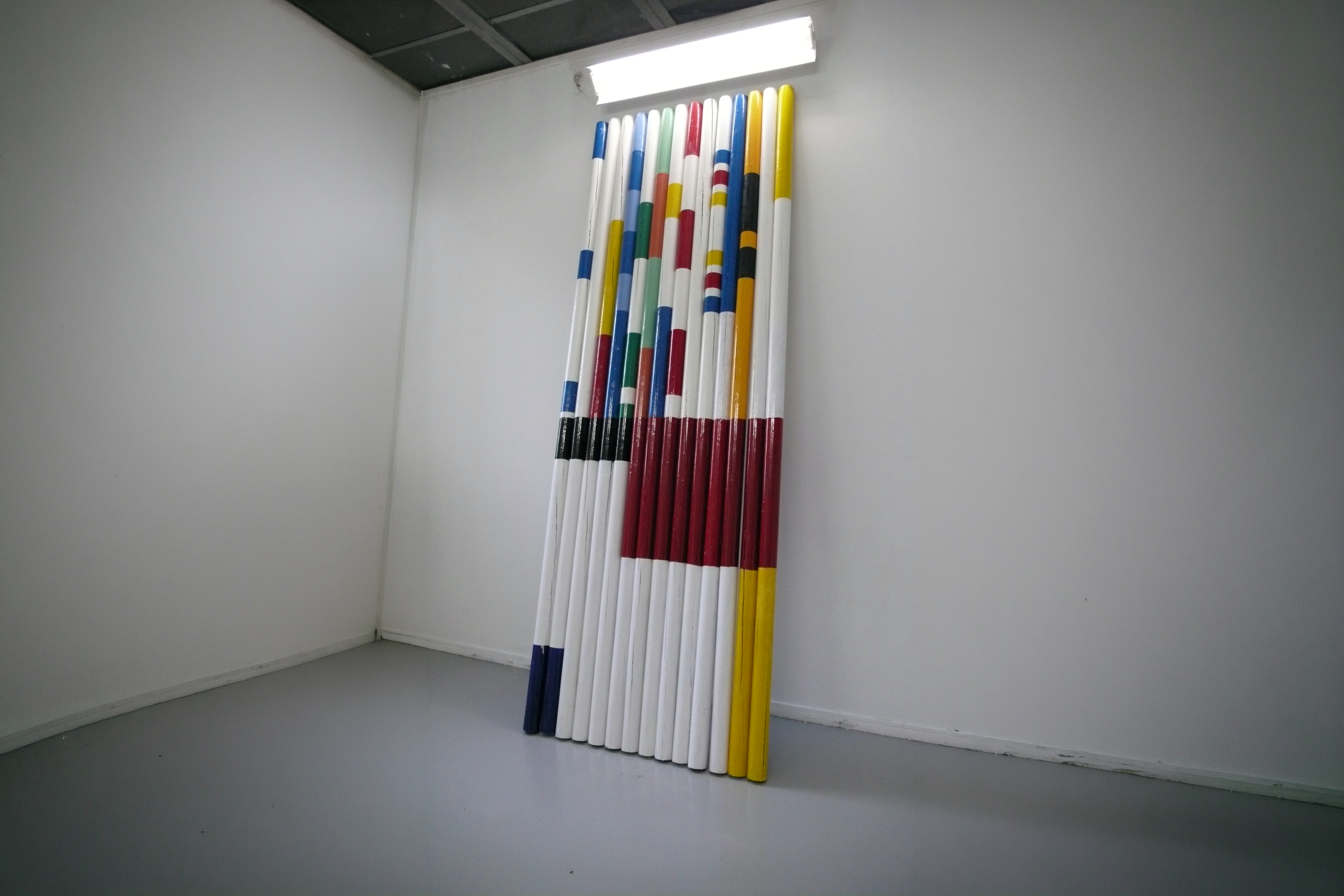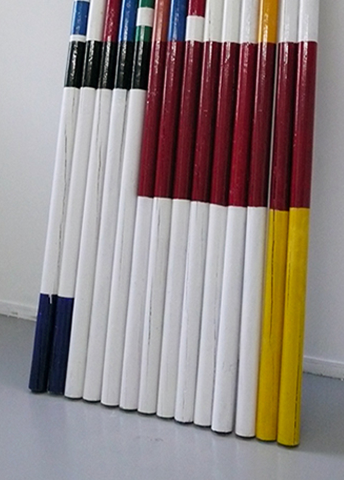 Thus these immense compositions of five metre high jumping poles, placed at an angle against the wall, express a sort of homage, or more precisely, an impulse of inspiration. Here mounir fatmi creates connections, enigmatic at first, between Mondrian's oeuvre and the forest. Close observation reveals a pictorial composition, in the lower half, that is similar to a well-known Mondrian, whereas in the upper half, the composition appears to be dismantled and deconstructed: it becomes – or harks back to - the original jumble of the forest. Along the same lines, the jumping poles – one of mounir fatmi's typical materials – remind us of their natural origins. They are made of wood and their verticality is reminiscent of trees' soaring upward momentum. They have solid strength of presence, but also a fragility, suggested by the broken bar.