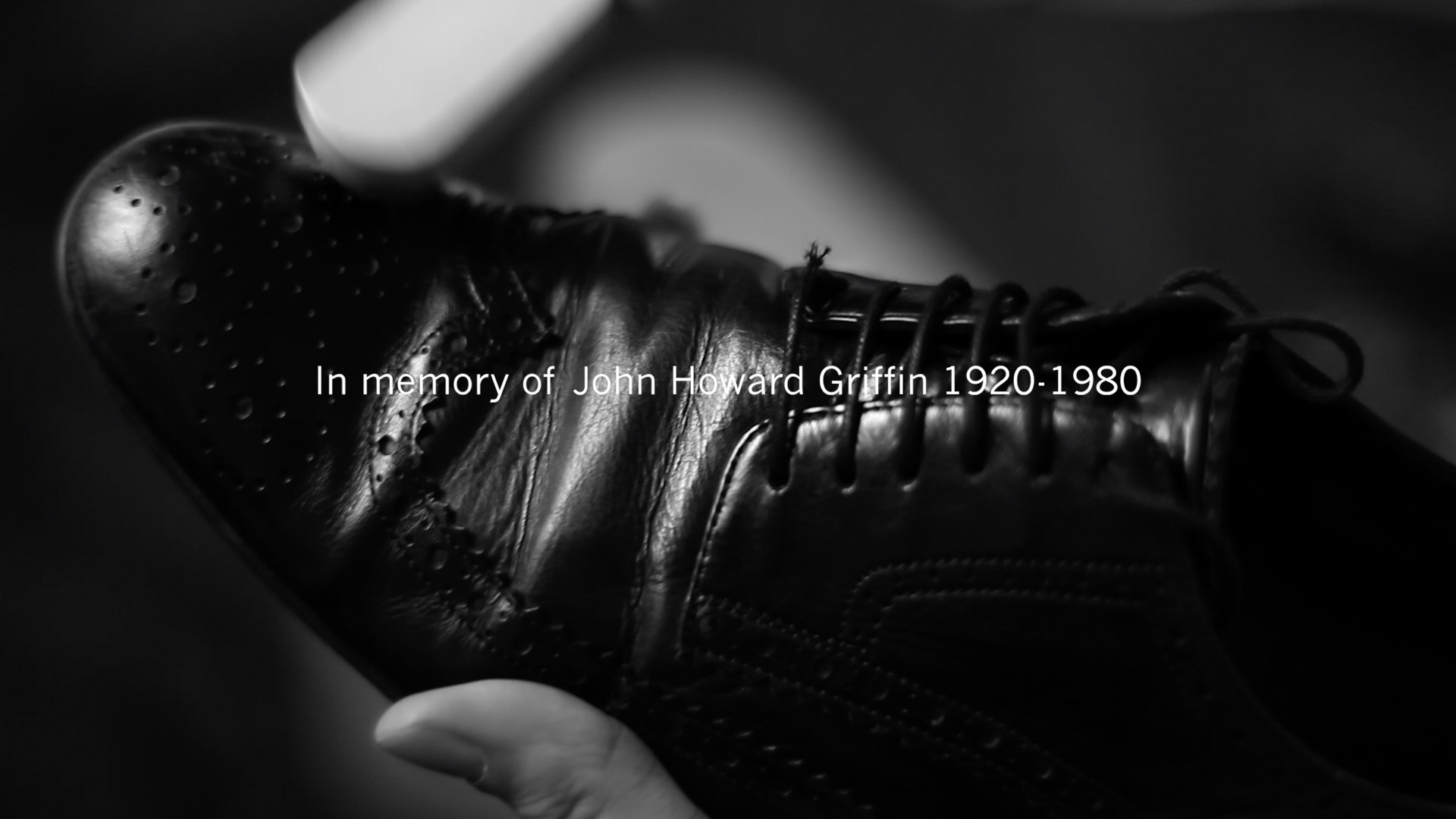 edited together with shots of Fatmi methodically blackening his hands—palms too!—with shoe polish, in a nod to the only job Griffin was able to get while black.”