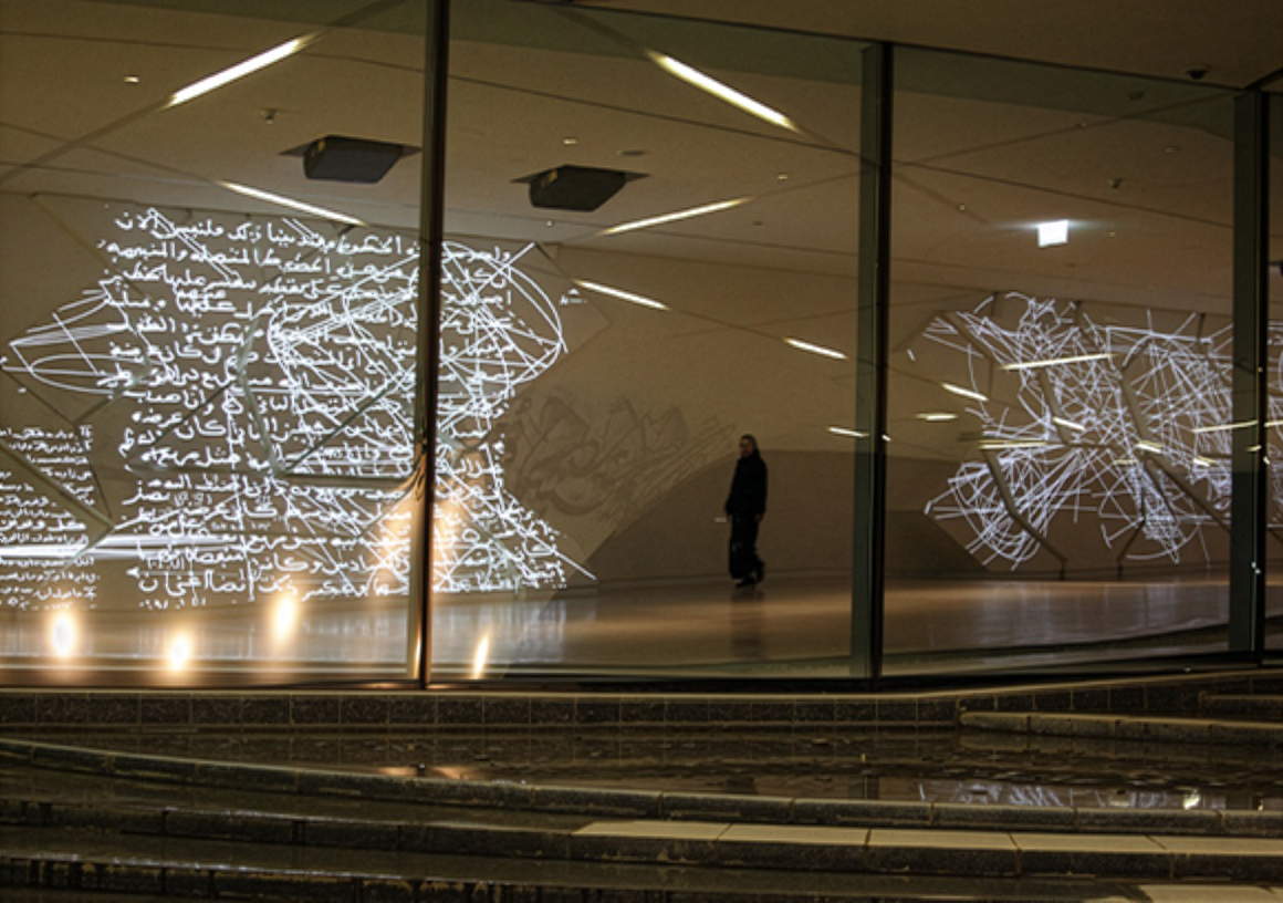 mounir fatmi wishes to use the original drawings found in the fragments of these books, and make a transfer from the book to the movie. The intention of the artist is to change our intimate and personal relationship to the book by transposing it into a video work accessible to the largest number for a collective experience related to knowledge and architecture. By combining writing and geometry in the work the Book of Perfection, it is to rediscover the surveyor king and the lost book. On three levels of projection, the video installation will consider the movements of students in its development. The text of this lost book is written and erased following the oblique geometric lines of the architecture. Geometric shapes from the drawings of Al-Mutaman translated into three dimensions, to pass from the plan to the depth, will appear and disappear and operate metamorphoses with the circulation of the students in the space.