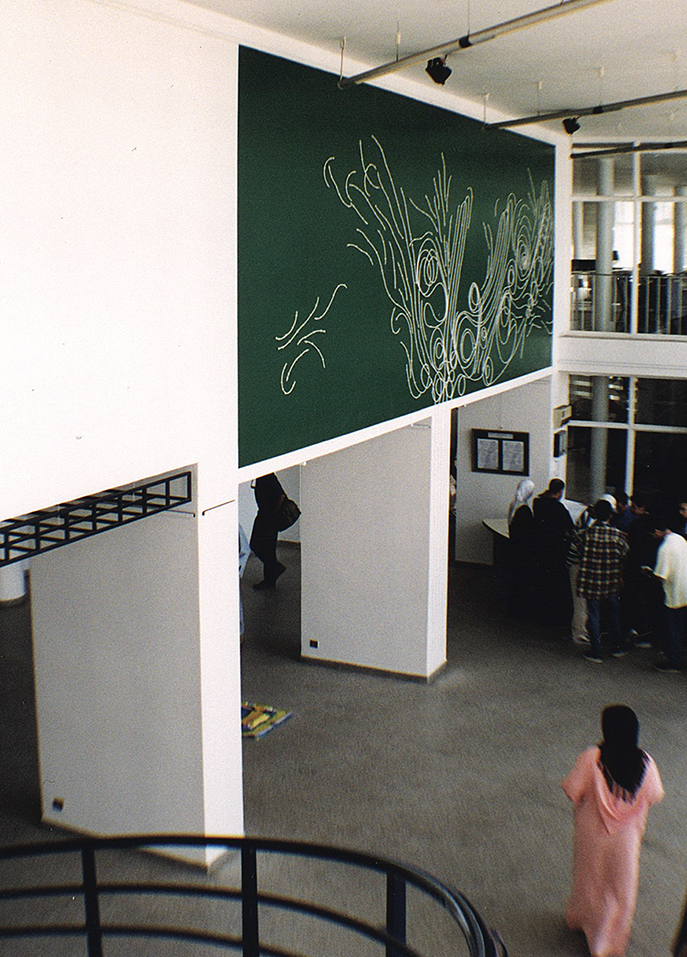 Mounir Fatmi’s artistic project was inspired by Jackson Pollock’s series Arabesques, painted around 1948, whose title created a bridge between American art of the 1940s and 1950s and Arab-Muslim art. Connections explores the field of cultural interactions by reuniting contemporary art techniques, such as all over and dripping, and the artisanal techniques of Arab calligraphy, with their ideal and sinuous lines. “Tribute”, as this piece is meant to be the affirmation of a reference and a testimony for esteem. It constitutes a sign of respect for disrespect, seen as a form of emancipation from the rules of pictorial composition, artistic conventions and social stereotypes… In a context of cultural exchanges, the piece also evokes the relation between artistic creation and spatial or geographic movement or displacement.