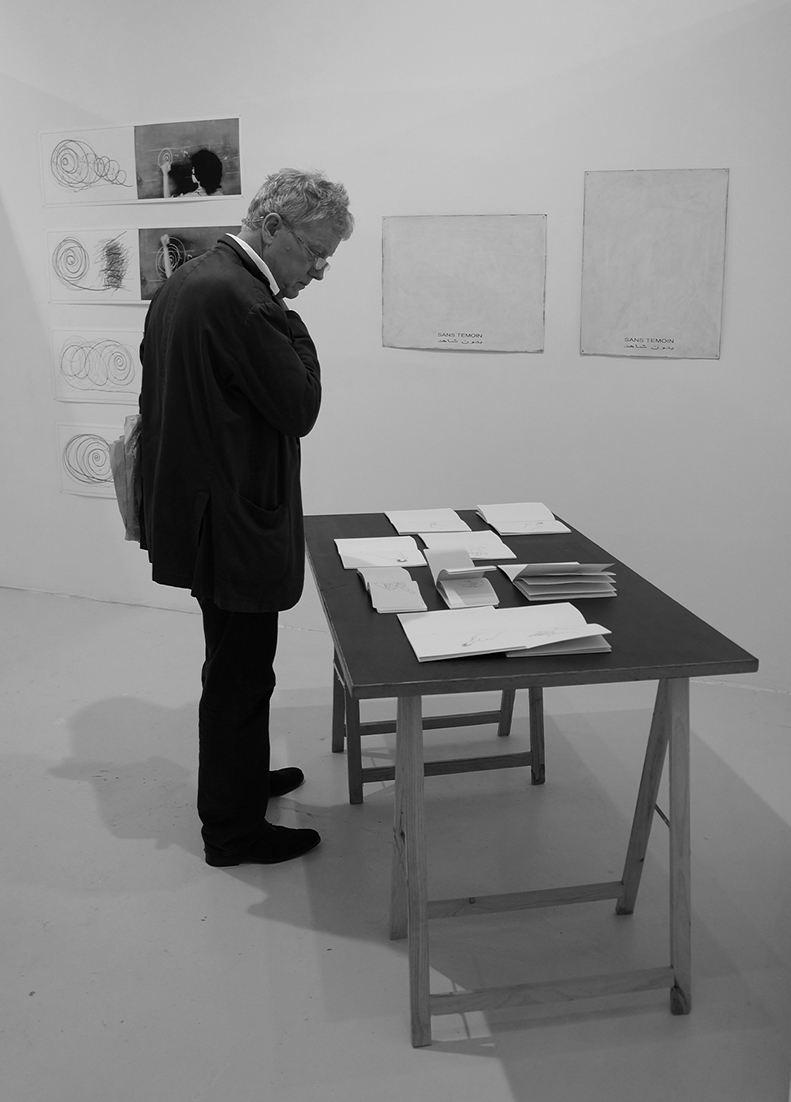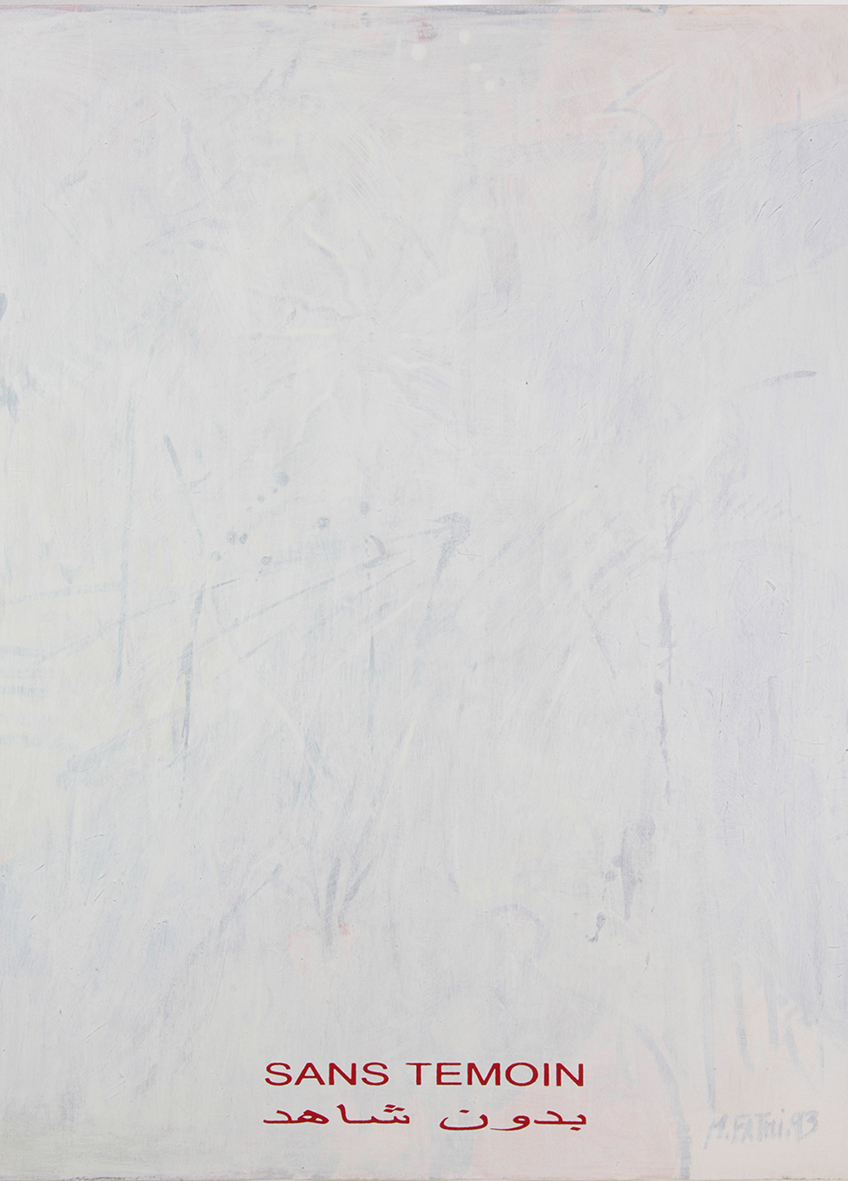 Projet conceptuel inscrit dans une série procédant par l'application sur des toiles de plusieurs couches de peinture blanche, « Sans Témoin » est associé aux œuvres « Coma », ou encore « Effacement Mémorisation » réalisées entre 1995 et 2003. Les supports de ces compositions monochromes obtenues par recouvrement sont constitués au départ par des tableaux réalisés et exposés antérieurement par l'artiste, au style proche de l'abstraction et de la figuration libre, qui ont bénéficié de la reconnaissance du milieu artistique et de la critique. « Sans Témoin » est une série d’œuvres peintes et effacées qui privent le public de la possibilité de les voir dans leur état originel et suppriment le spectateur au sein de la chaîne de création et de monstration. Seul le titre de la série, sérigraphié en français et en arabe en lettres rouges et à même la toile, en quelque sorte estampillé, atteste de l'existence d'œuvres avant leur effacement.