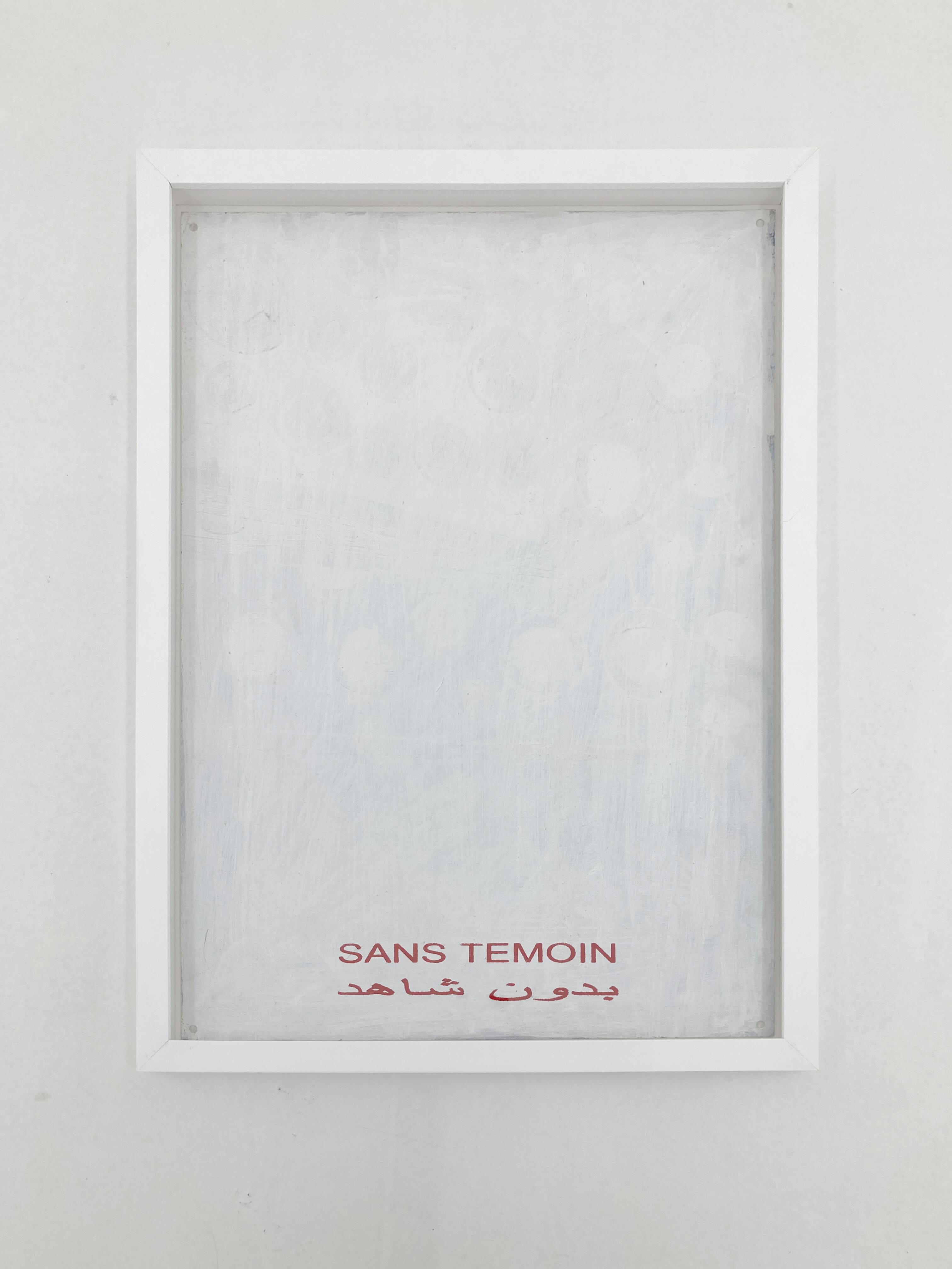 A conceptual project that is part of a series consisting in the application of several layers of white paint on canvasses, “No Witness” is associated to works such as “Coma” and “Obliteration Memorizing”, created between 1995 and 2003. The medium for these monochrome compositions obtained through a process of covering up, initially consists in paintings previously created and exhibited by the artist, with a style close to abstraction and free figurativeness, and which enjoyed a certain recognition from the artistic milieu and critics. “No Witness” is a series of works painted and then erased, which deprive the public from the possibility of seeing them in their original state, thus removing the viewer from the chain of creation and exhibition. The title of the series, printed in French and Arabic in red letters directly on the canvas, like a stamp, attests to the existence of the works of art before they were erased.