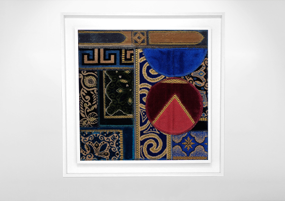 The largest in this series is the triptych titled, Labyrinth N° 5, 2012. Made with fragments of deep midnight blue, gold, and silver embroidered carpets, Labyrinth N°5 calls to mind a deconstructed Baroque church or Byzantine mosque.  Repeating geometric patterns of small circles bordered by thick lines are placed vertically and horizontally, the dots moving up and down like some mesmerizing video game. There are layers of cutouts that are more ornamental with floral or lace-like patterns, as well as architectural and frame motifs. The eye moves up and down, right and left, seeking an escape, but there seems to be none, there is no open space, no end. Like the patterns of actual labyrinths, the work is at once rhythmic and claustrophobic.