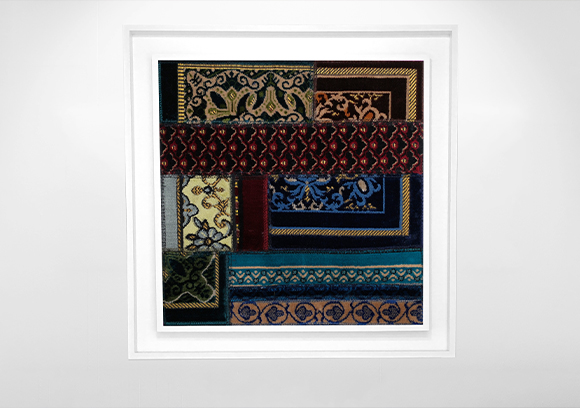 La plus grande pièce de cette série est un triptyque intitulé Labyrinthe N°5 (2012). Fait de fragments de tapis bleu nuit, dorés et argentés, Labyrinthe N°5 fait penser à une église baroque déstructurée ou à une mosquée byzantine. Des motifs géométriques répétitifs de petits cercles enserrés dans des lignes épaisses sont placés verticalement et horizontalement, donnant l’impression que les points montent et descendent comme dans un jeu vidéo hypnotique. Il y a des couches de découpages plus ornementaux, avec des motifs floraux ou semblables à de la dentelle, tout comme des motifs architecturaux et évoquant des cadres. Le regard monte, descend, va de gauche à droite, cherchant une issue, mais il semble n’y en avoir aucune ; il n’y a ni espace vide, ni fin. Comme les motifs d’un vrai labyrinthe, cette œuvre est à la fois rythmique et claustrophobe.