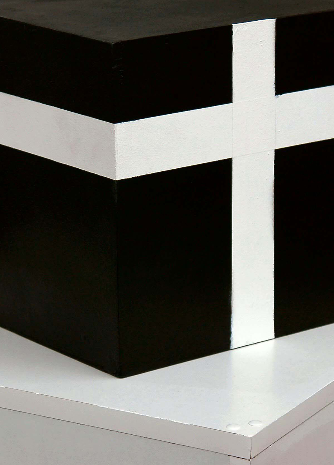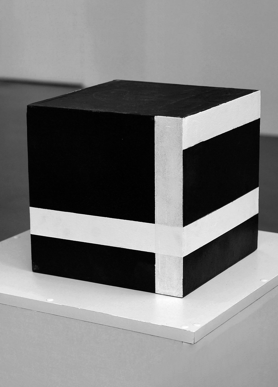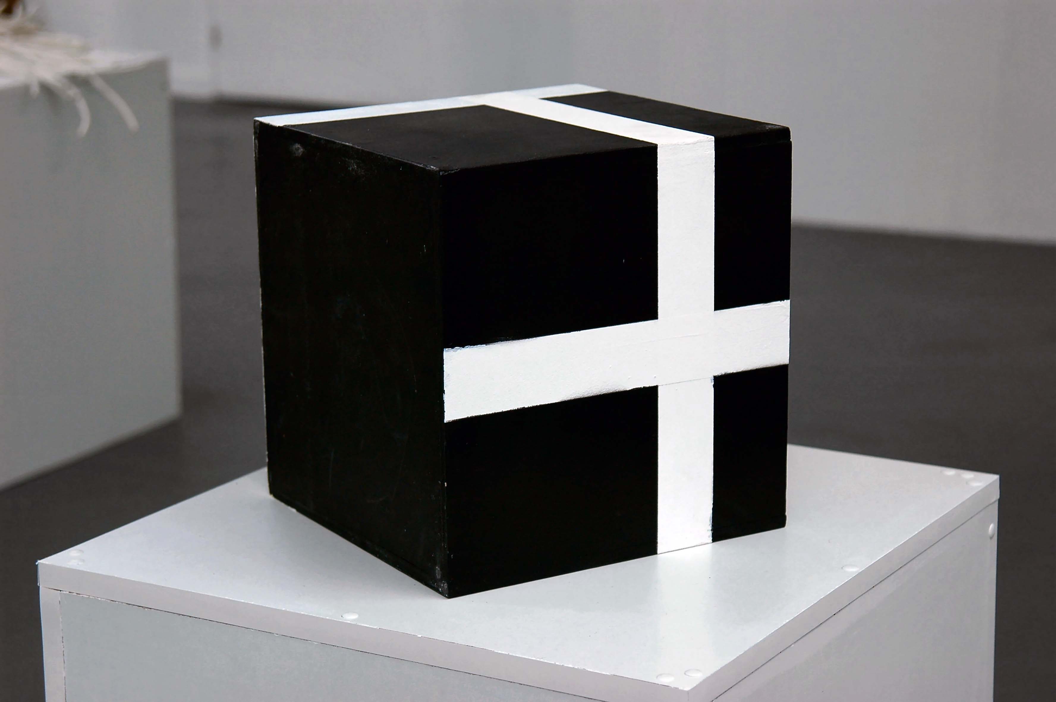New Proposals is a sculpture that focuses on the viewer’s sensitive experience in a context where the object is available for direct appropriation. Resting on a pedestal, a black cube with white stripes is constructed following a minimalist esthetic that draws its strength from the small amount of materials employed.