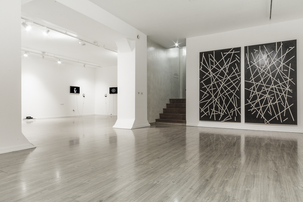 Unable to settle, the viewer’s eye moves from one panel to another. The effect is accentuated by the conflicted aspect of the geometric lines. The viewer is confronted with a surface full of tension composed of empty and full spaces against a black monochrome background, engraving the image of the work on the retina, even with closed eyes.