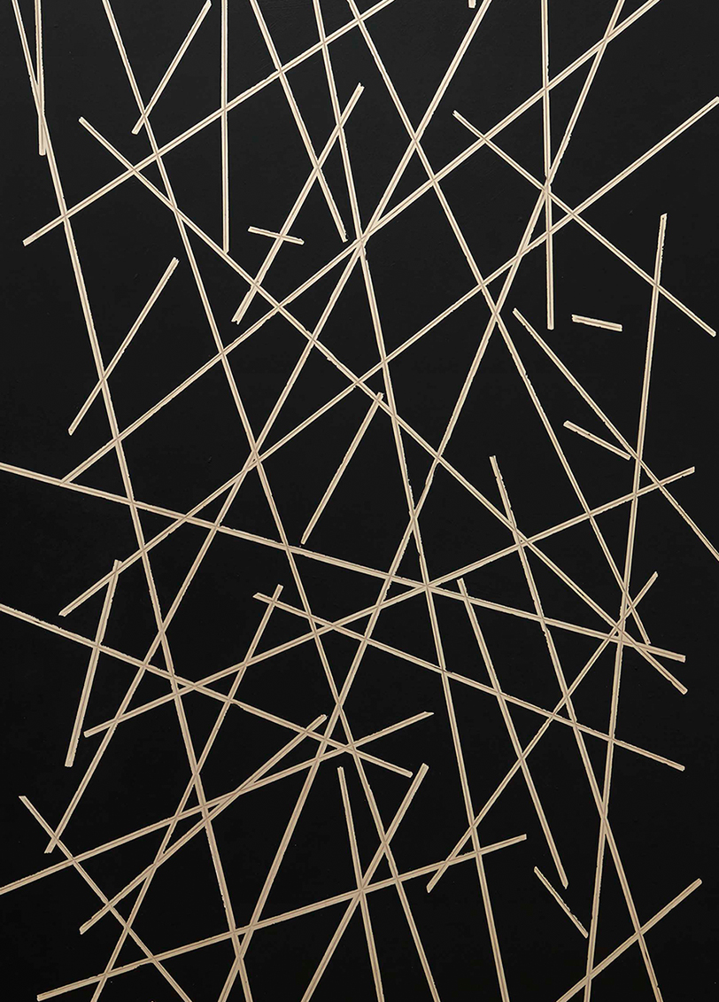 Martyrs is a series of works composed of wood panels on which a multitude of lines, like scars on a body, are painted on a black background. The title of the work, Martyrs, rests upon the word’s double definition. Its most frequent sense refers to the biblical characters who let themselves be killed as a sign of their faith, but in French a “martyr” is also a term of cabinetmaking designating a block that provides protection against the strikes of a hammer or saw.