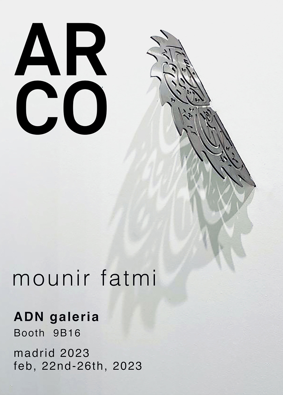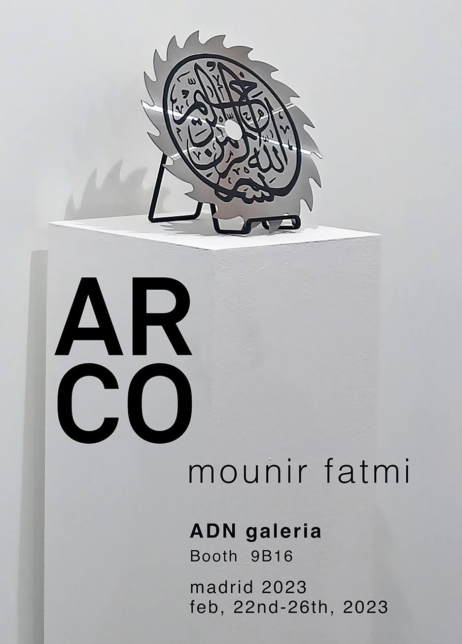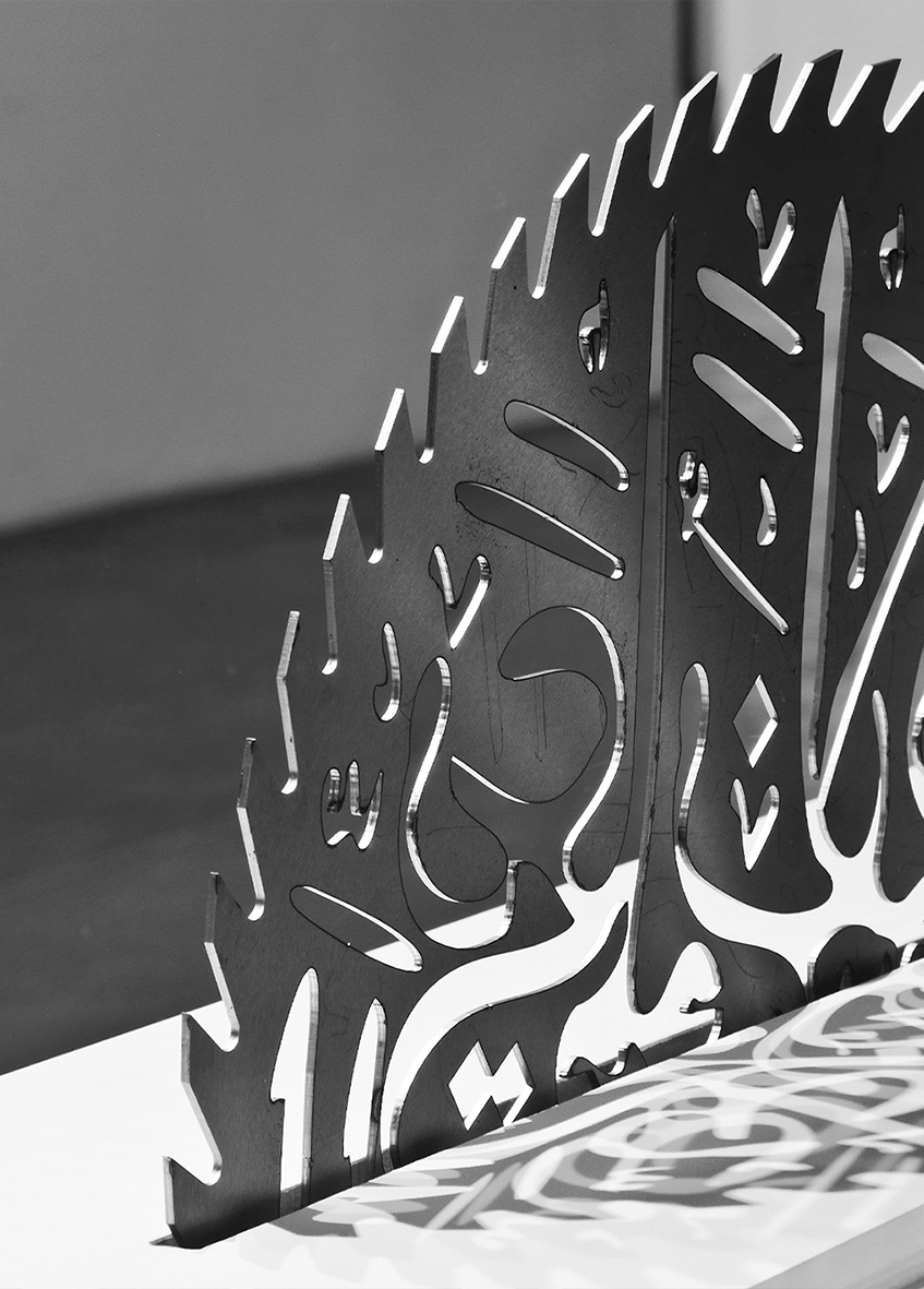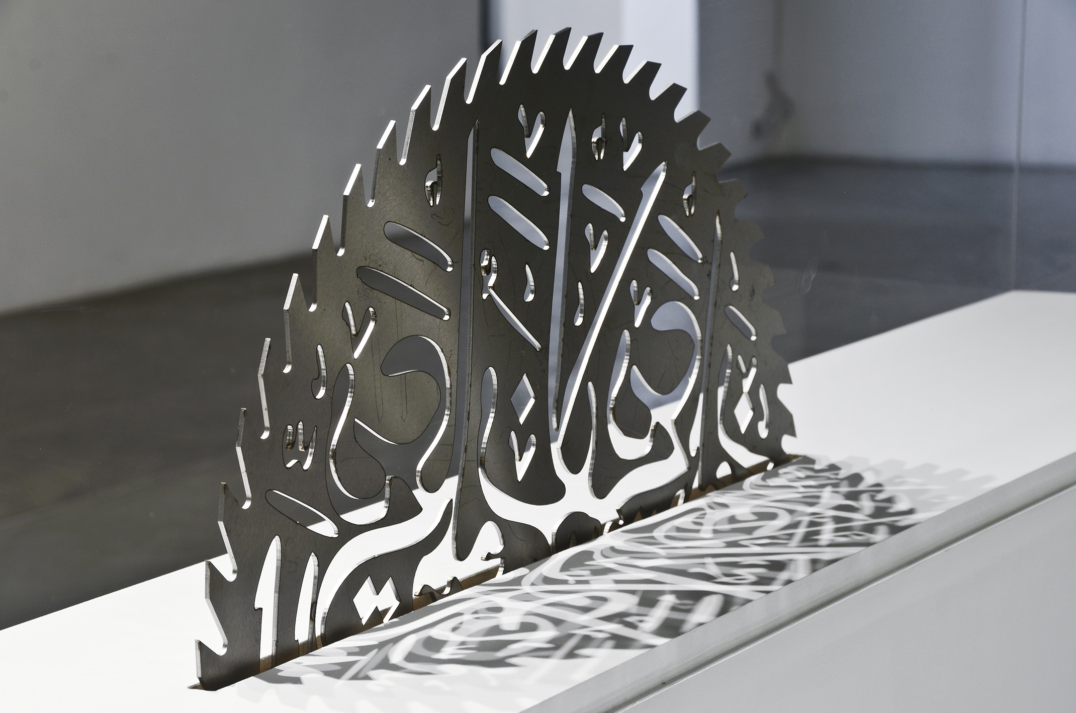 “Cuts” is a series of sculptures created with circular saw blades whose untreated metallic surfaces are pierced with laser-cut motifs of Arab calligraphy. The blades are placed on white pedestals, and they seem to sink into them through the action of their sharp teeth. A transparent Plexiglas structure surmounts the installation, its utility seeming to be to protect the public from possible injuries rather than to protect the work within its museum setting.