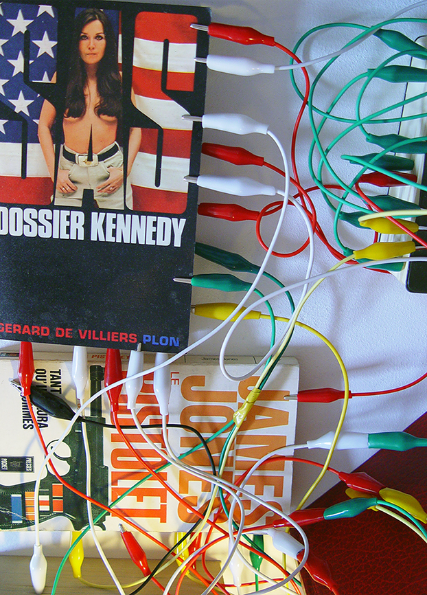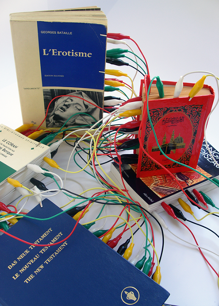 The piece asserts a certain vision of reading and of intellectual activity in general. To the artist, reading and reflection are fundamentally about drawing connections: a book does not exist in a vacuum, but in relationship to other texts – adding to them, modifying them, contradicting them. Indeed, at the core of the idea of intertextuality, and indeed at the core of all forms of relationship building, is the desire to discover or create links between elements that, on the surface, seem to have nothing in common. In this way, the act of reading becomes like a journalistic or criminal investigation (as certain books on view attest), requiring the reader to connect the necessary clues. To use the analogy of an electrical network, reading is an activity that is intense, energetic… and not without risk. Reading confers great liberty upon the reader, it is therefore of great threat to dogmatic ideologies everywhere. We are never so free as when we read to make the connections that we desire.