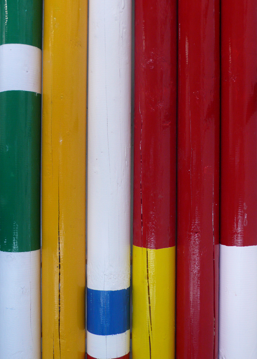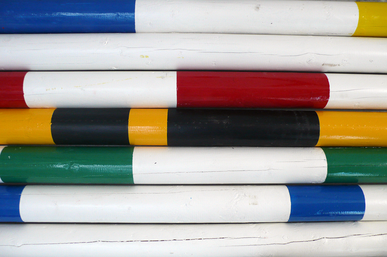 Ici, les barres de saut d’obstacles, matériel issu du monde hippique déplacé en matériau plastique, sont utilisées comme matière à une composition abstraite, à la forte dimension picturale.