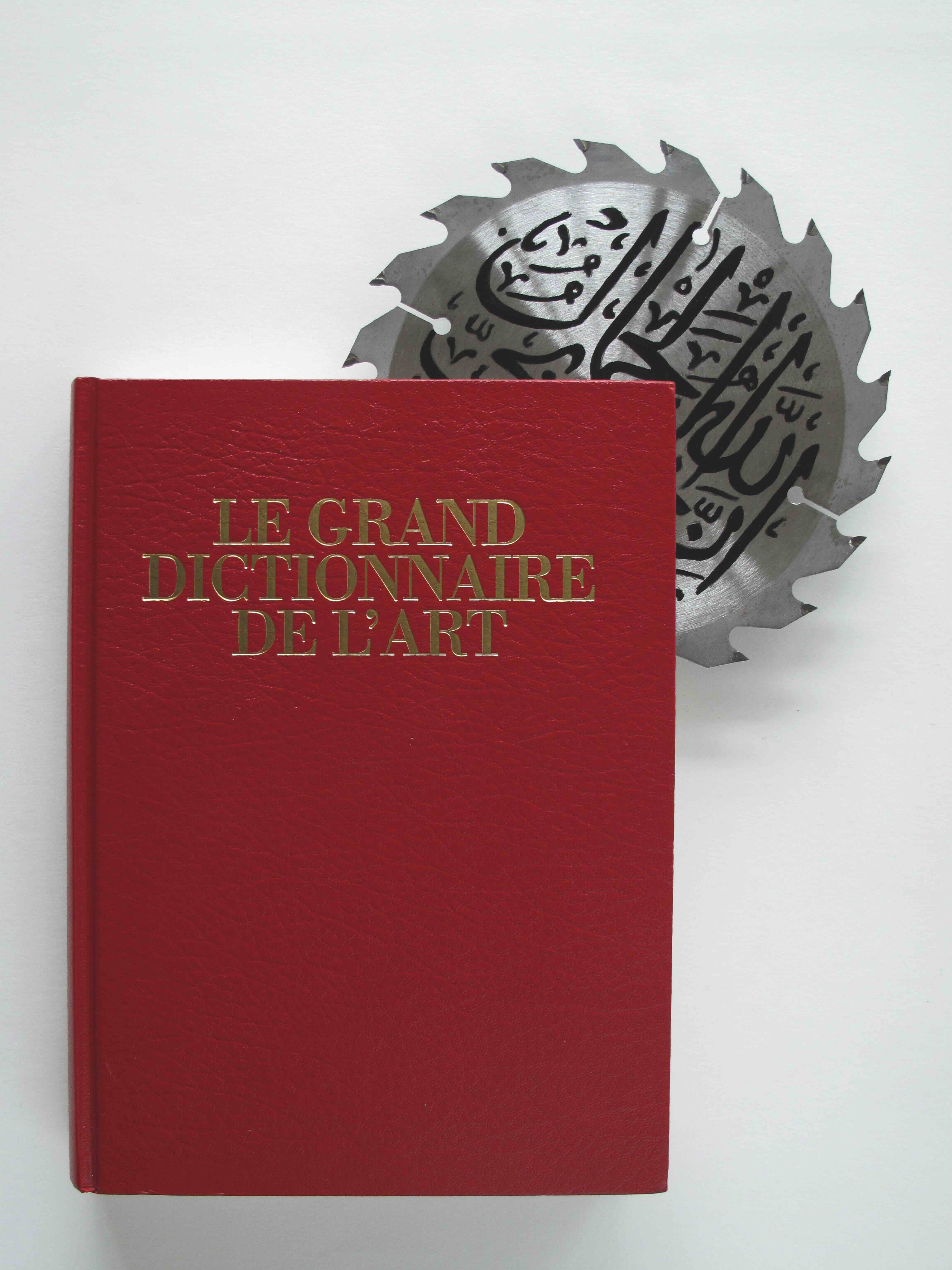 The photographs in the “Contamination” series present several books next to circular saws. One of them has a red cover, and its title “The Great Dictionary of Art”, is written in golden letters. Another shows a diwan, a collection of poems written by Husayn ibn Mansur (9th-10th century), a Persian Sufi mystic who wrote in Arabic, better known under the name of Hallaj, who was convicted of heresy and tortured to death in 922. The book, written in classic Arabic and richly ornamented, also features a title in golden letters. Circular saw blades have been slipped into the section of each book, the inscriptions on them partly disappearing between the pages.