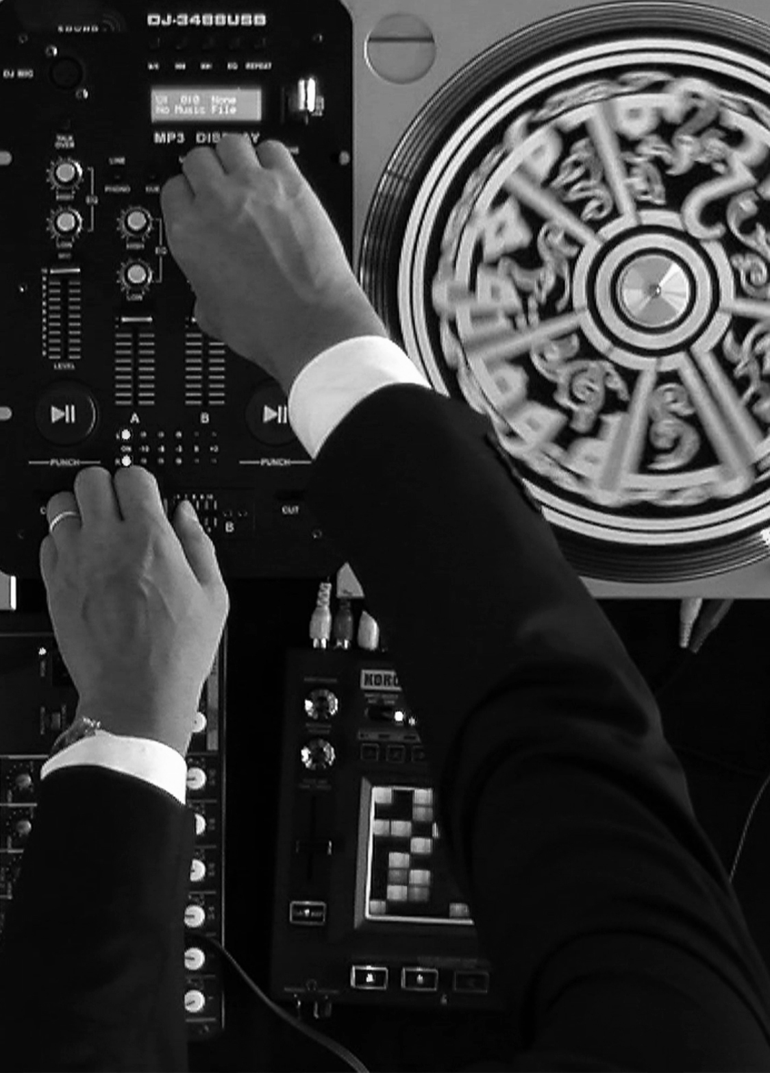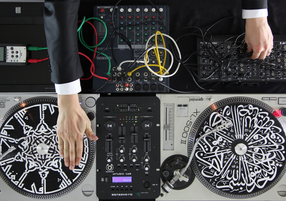 “Mixology” is a diptych of color photographs with a frame constituted by a DJ mixing deck, a device allowing the combination of several different audio sources. The deck is both digital and analog and comprises vinyl turntables decorated with cursive Arab calligraphy reproducing religious verses, as well as various electronic devices: amplifiers, microphones and switches. Multicolored electric wires connect all these elements together, crossing the image laterally, tracing loops superimposed on top of each other, while from the top of the image, a pair of arms emerges to manipulate them.