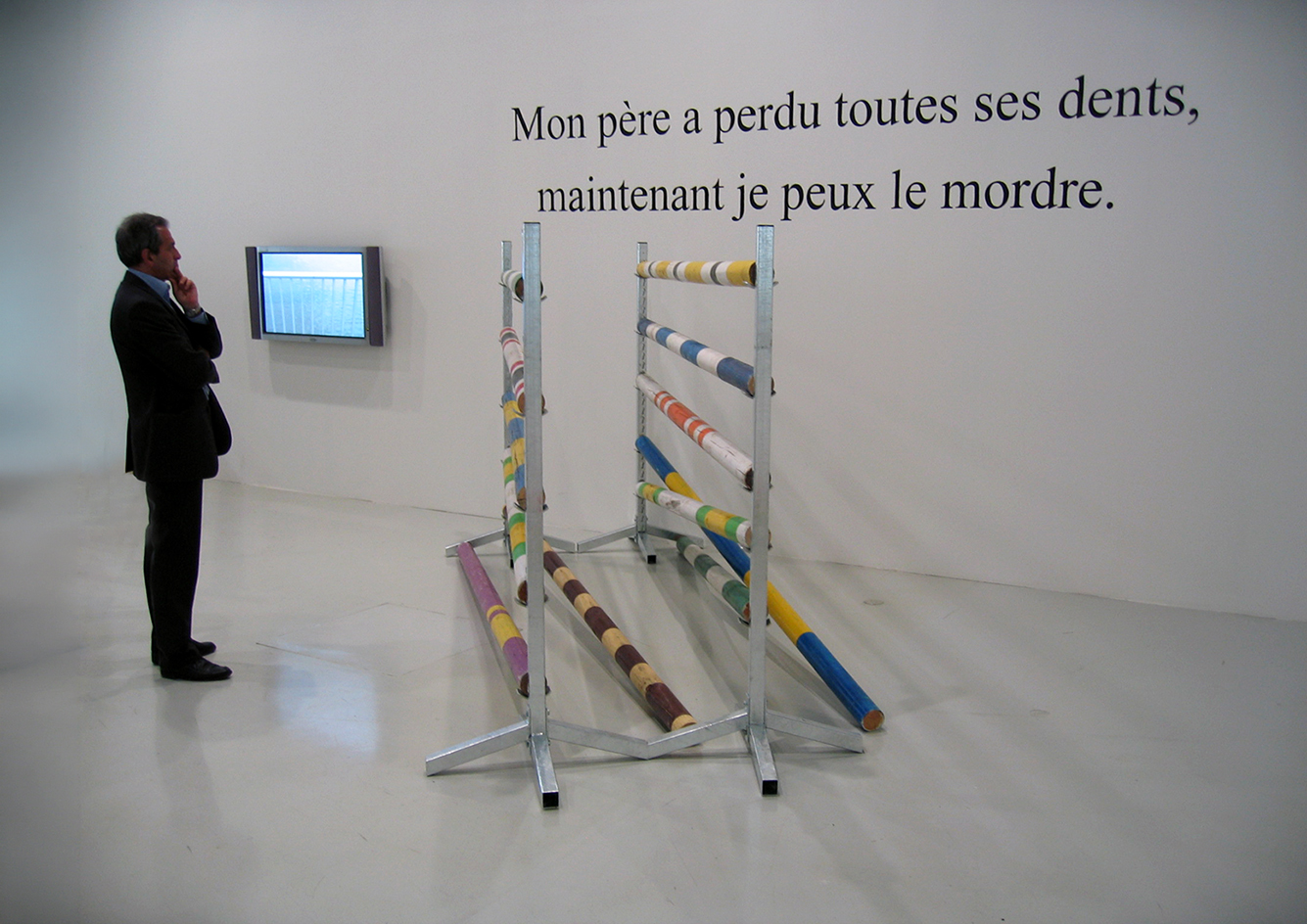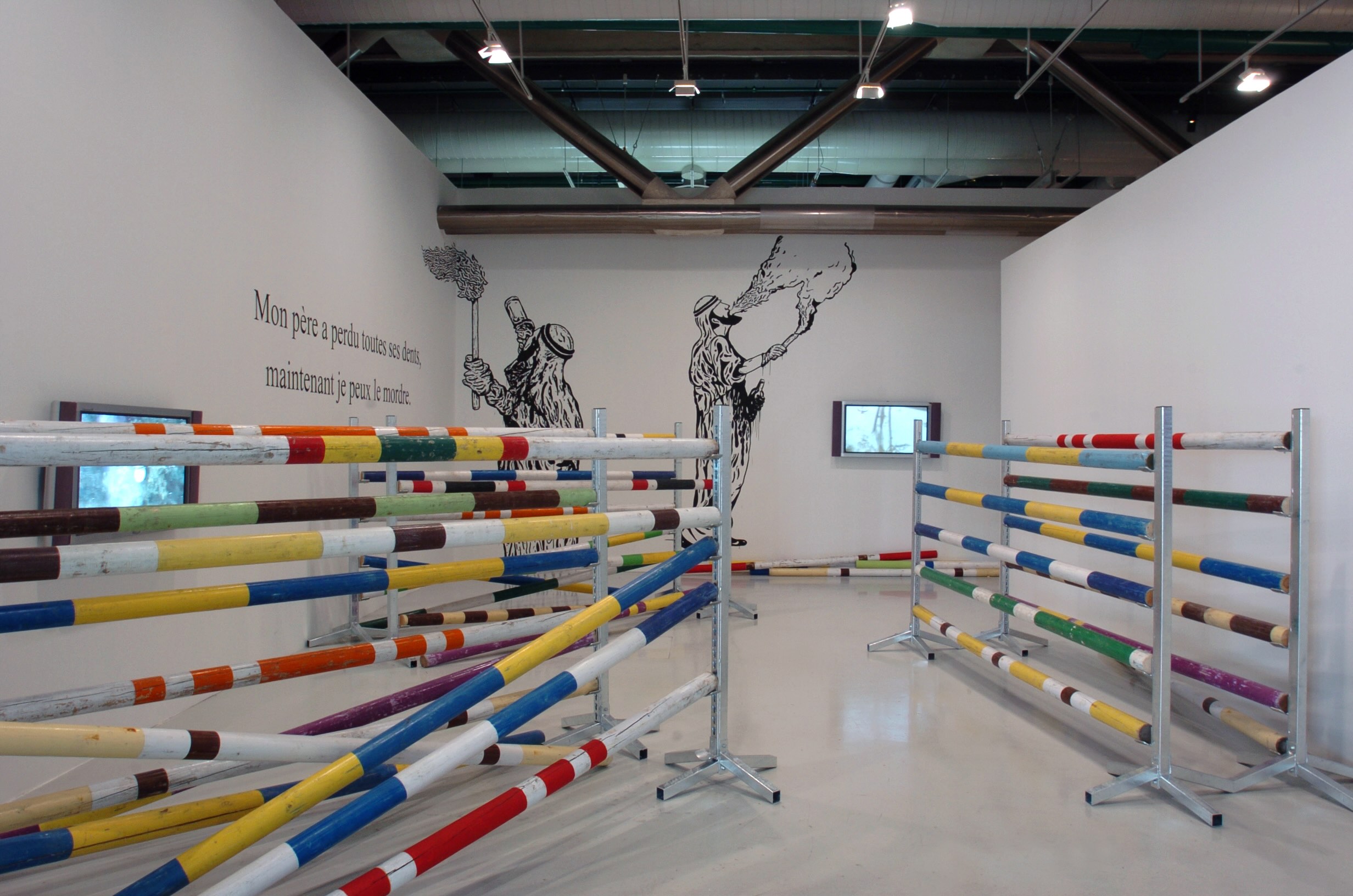 Les barres de saut d’obstacles, appartenant initialement au monde hippique, sont des signes récurrents, matériel détourné en matériau plastique, du vocabulaire formel de mounir fatmi.