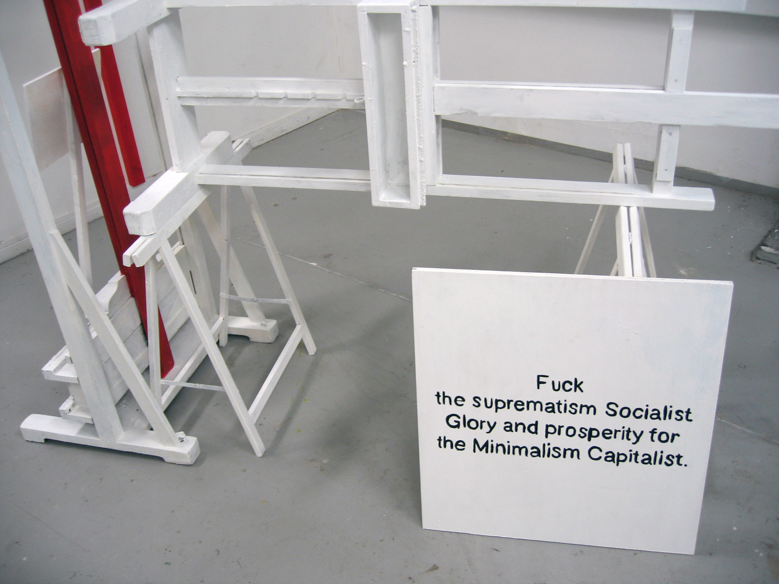 Considering the image – “The picture is almost monochromatic.” “There is no image on the canvas.” “There is ‘nothing to see’.” These are comments frequently heard about minimalist art, and yet, the “meaning” of the image is still questioned. In Minimalism is Capitalist the central part of an easel is painted in a bright red that contrasts with the “white on white” of the rest of the installation. This work suggests a recurrent motif throughout the major art movements in the 20th Century- from Suprematism to Constructivism, Bauhaus to De Stijl, Minimalism to Conceptualism, as well as to the Christian cross, the canonical image in western art history. It was this same easel (whether of Matisse or Delacroix) that was introduced in the colonized East, steering Arab artists away from the ornamental style and encouraging them, for a moment, to copy the figurative styles of oriental and occidental art history. Through this encounter these artists began to question their relationship to the image, eventually rejecting the use of the figure as an imitation of the divine, and began once again, to use non-representational imagery in their work. It is this easel that the Russian Constructivists in the 1920’s, were compelled to remove and which the American Minimalist movement in the 1960’s would finally disintegrate.