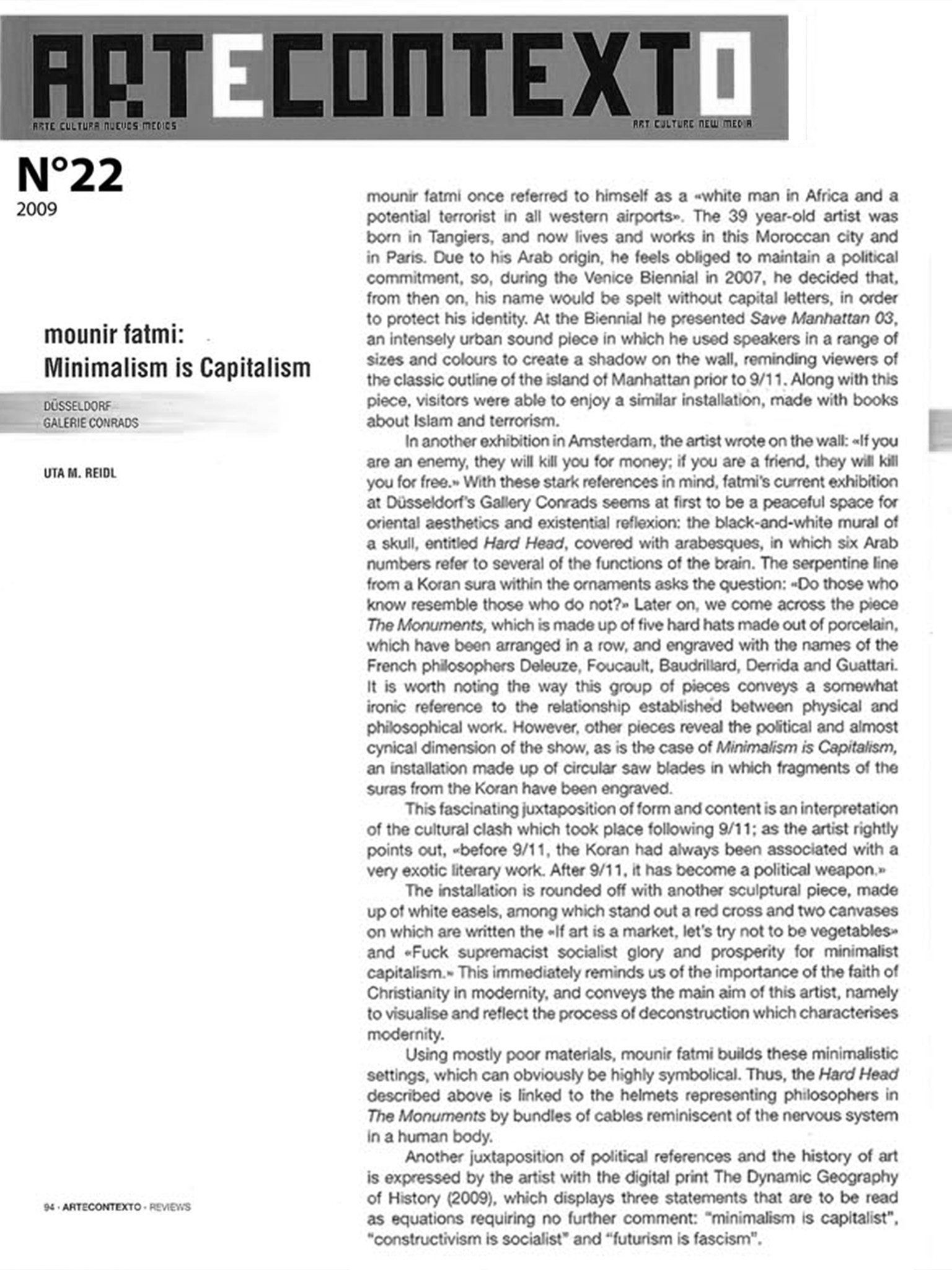 Le manifeste du Bauhaus annonce : « Le but final de toute activité plastique est la construction » Cette construction que mounir fatmi entend, d’oeuvre en œuvre, déconstruire.