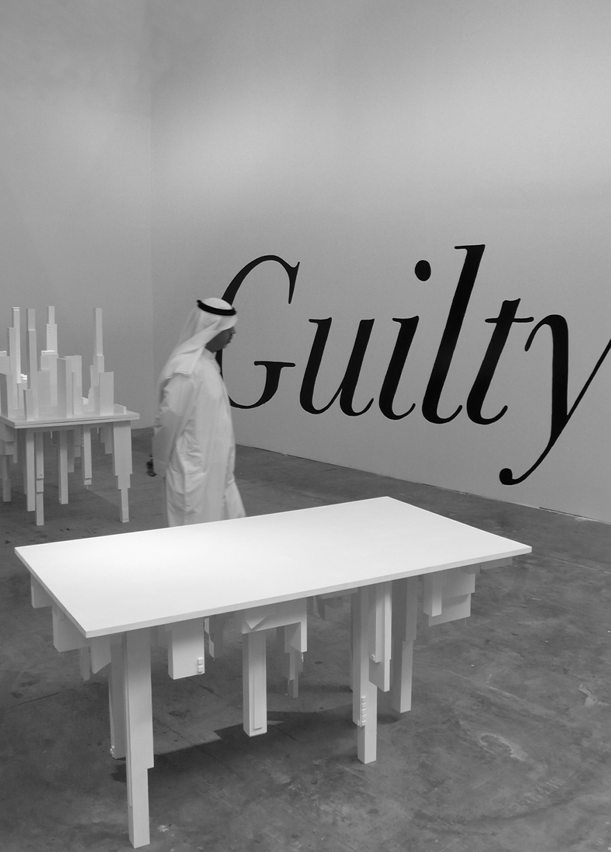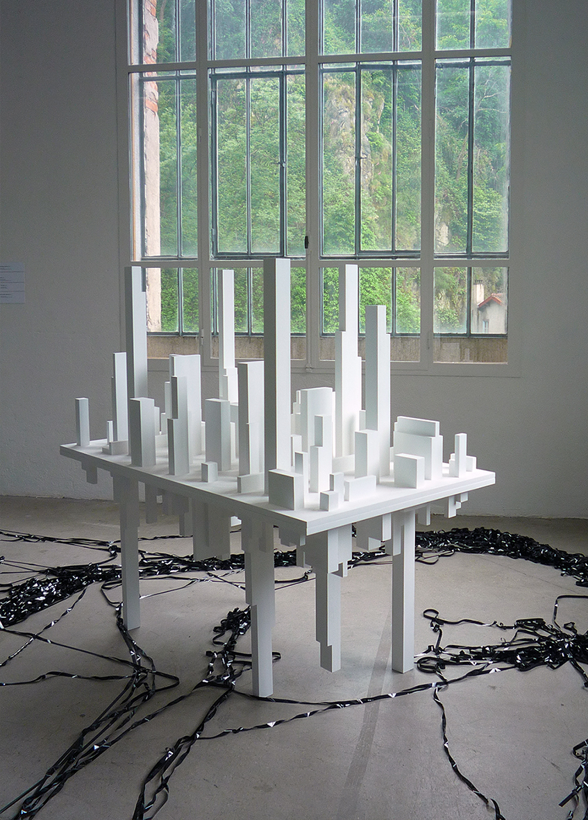 For the installation, three tables are placed in a room and under each table people can see wooden sculptures of the skyscrapers of a big modern city. Those cities generate a lot of pollution. When you look on the top, those are regular tables symbolizing the discussion area for ecological topcs. It’s a very trendy subject. But its uncomfortable to sit down at these tables, the sculptures beneath get in the way. On the wall, there are three video projections showing different landscapes (urban or natural). It’s a geographical disturbance: you don’t know where the pictures were taken and you don’t know what “paradise” we are trying to reach.
