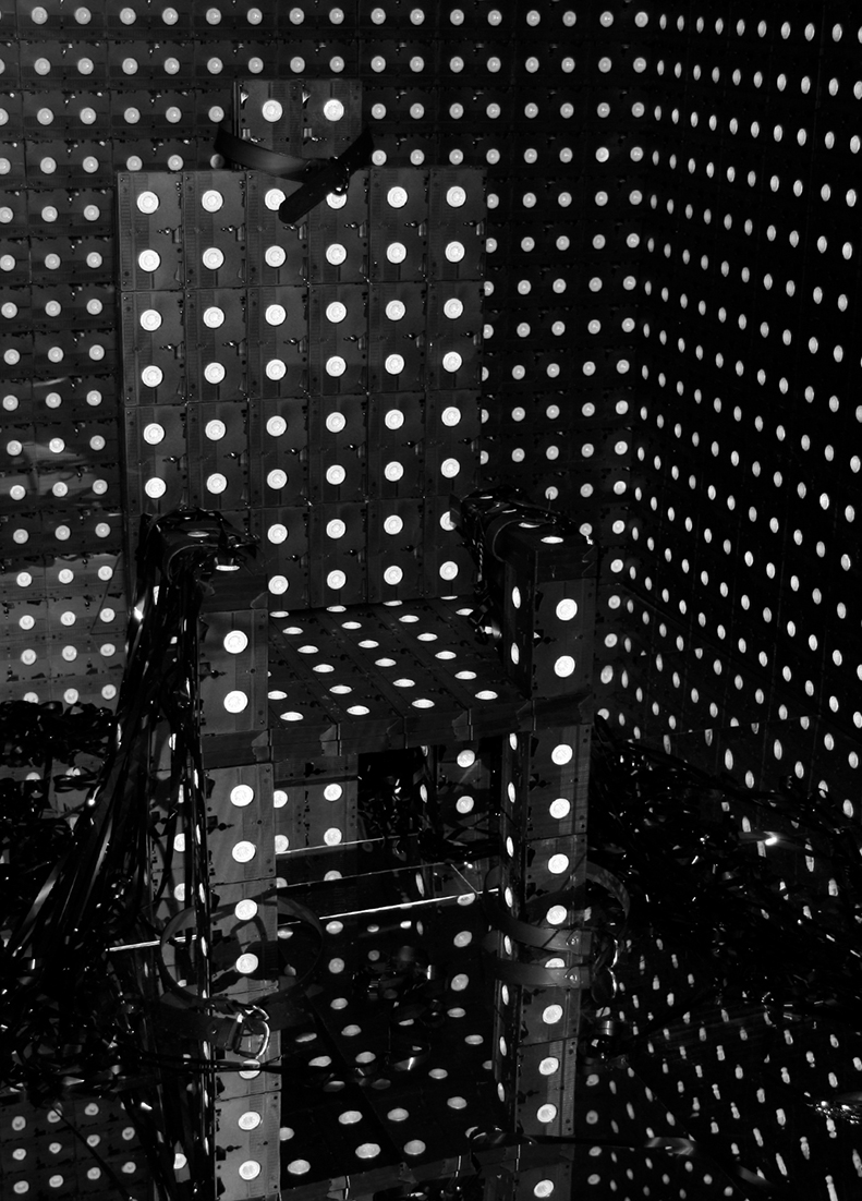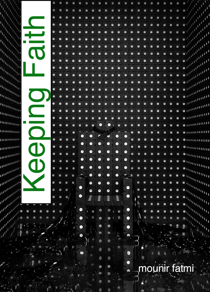 The use of VHS cassettes as construction material – a recurrent motif for mounir fatmi, used in a new way here – opposes the pop quality with an aesthetic that has its roots in the rigourous geometric compositions of concrete art or minimal art: the repetitive motif of white circles (the cassettes winding pivots) on a shiny black background. The choice of this material, added to the dimension of the installation's environmental construction gives rise to surprising optical effects. Depending on where you position yourself, the object melts into its environment, its volume appears trapped, swallowed in the grid of motifs. In a similar way to what underlies “Brainteaser for moderate Muslim” (2004), Keeping Faith develops a strategy which comes from both the