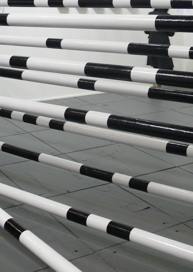 Several versions of Obstacles have been shown, in a variety of contextual configurations, like a sort of polymorphous sculpture. Whether straight in their stands, on the ground, precariously balanced or broken, the jumping poles play on the tension between construction and deconstruction, opening up interlacing points of view.