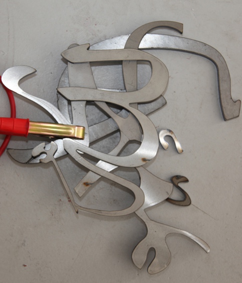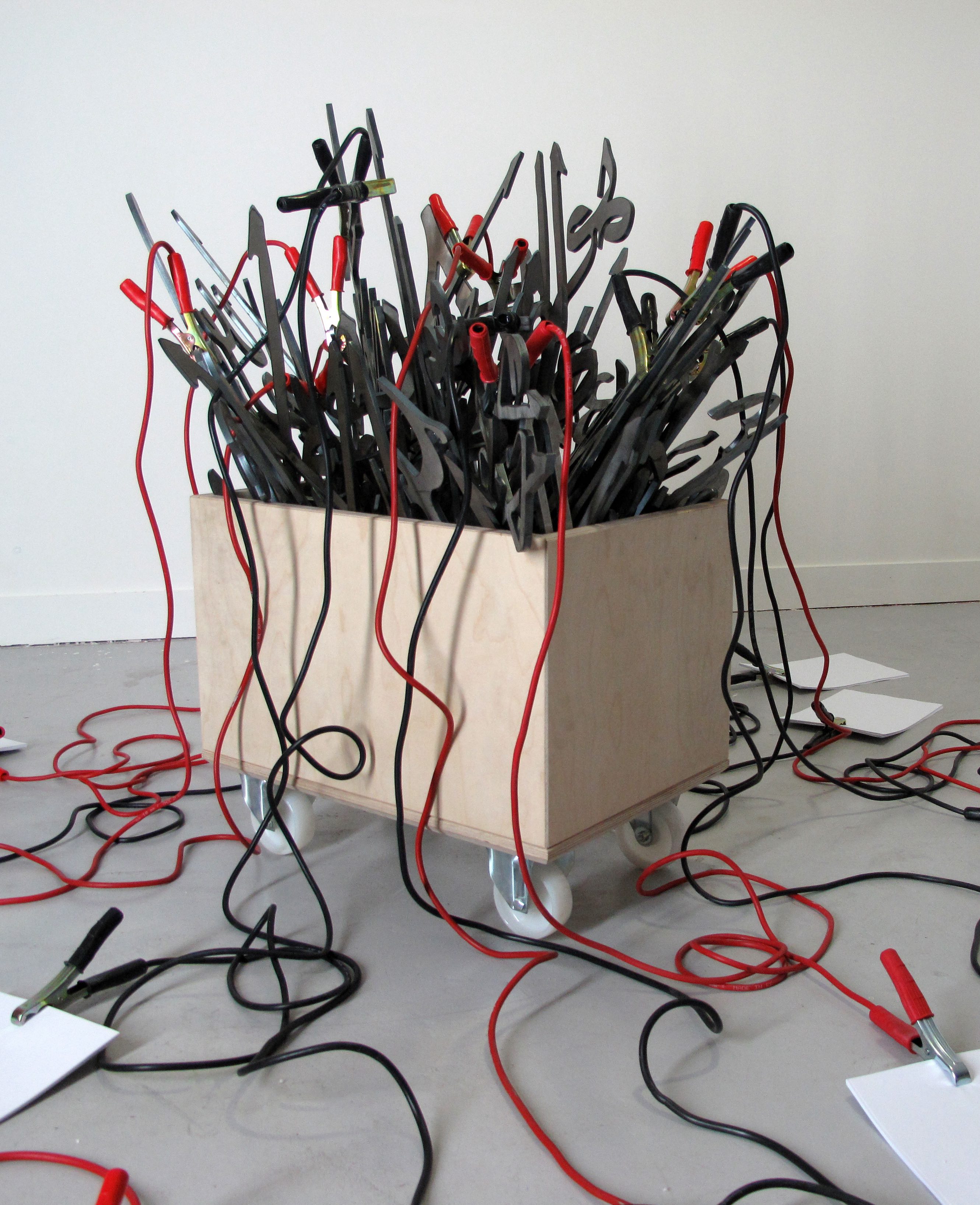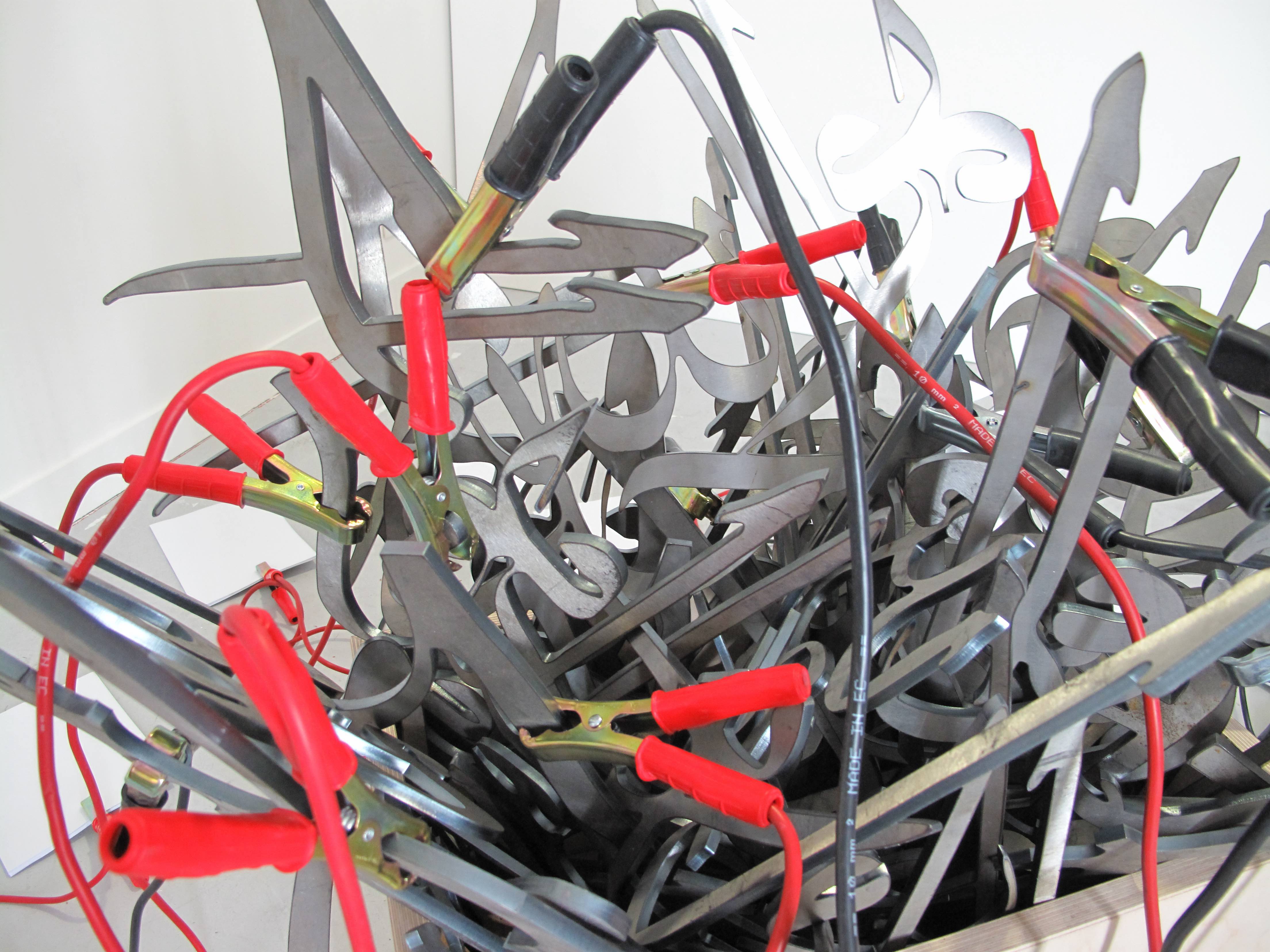 2011, 110 x 250 x 200, Arabic calligraphy in steel, wooden box, starter cables, paper.