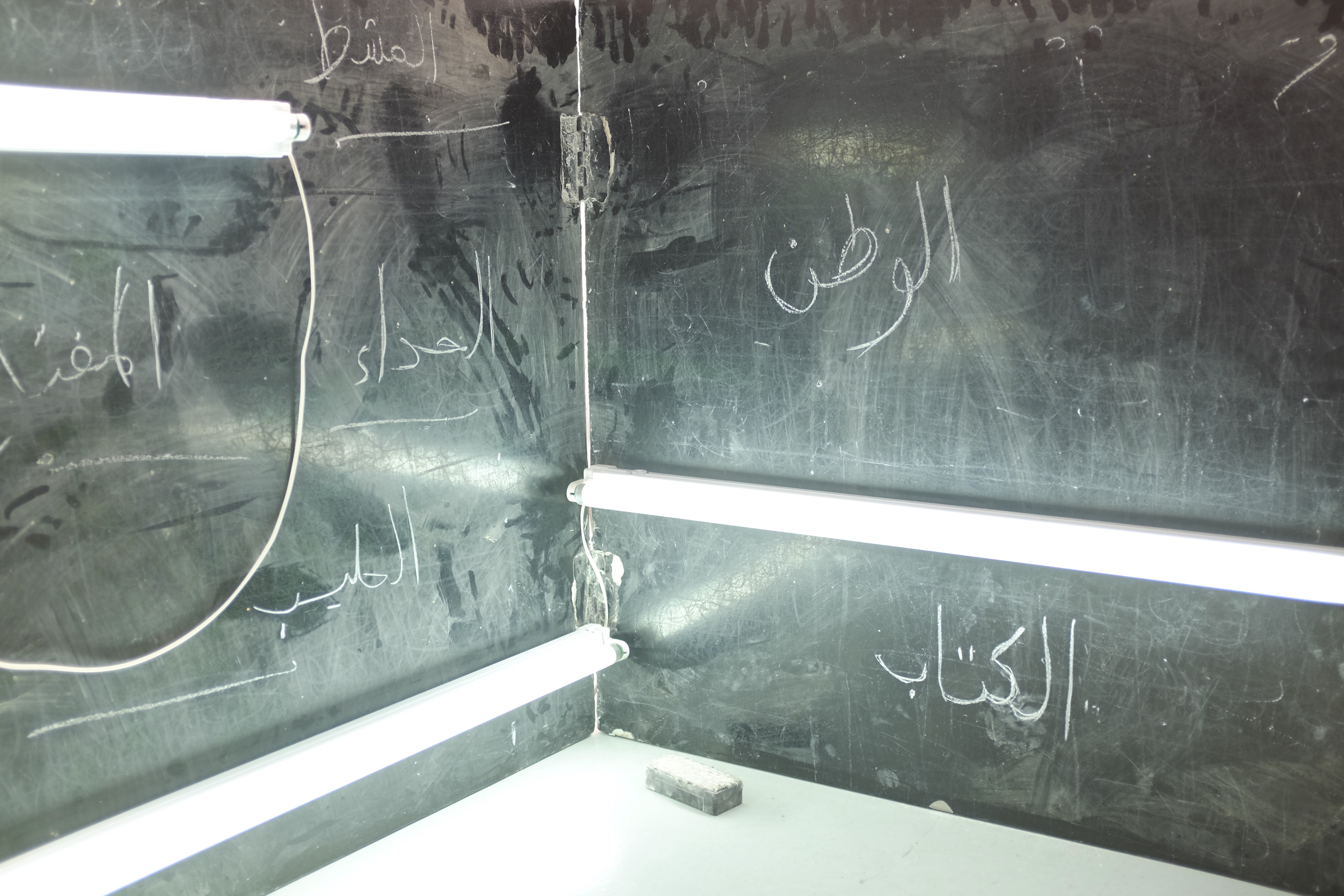 To answer these questions, The Blackboard invites the spectator to become a participant and obliges him or her to move in order to alternate the view of all parts of the piece, to adjust the distance of observation in correlation to the lighting that dazzles as much as it permits one to see, and to use white chalk and sponges to add one’s own contributions. The panels gradually become covered in inscriptions in different languages, traces of successive erasures, and mandalas as well as fleeting palimpsests. An object used for educational repression is destined to become a space of creation and recreation. Once the ambivalent role of education, language, and culture is revealed in the way we see the world, which allows us to see as much as it blinds us, The Blackboard invites us to overcome the obstacle as it proposes a way to reposition, participate, and share.