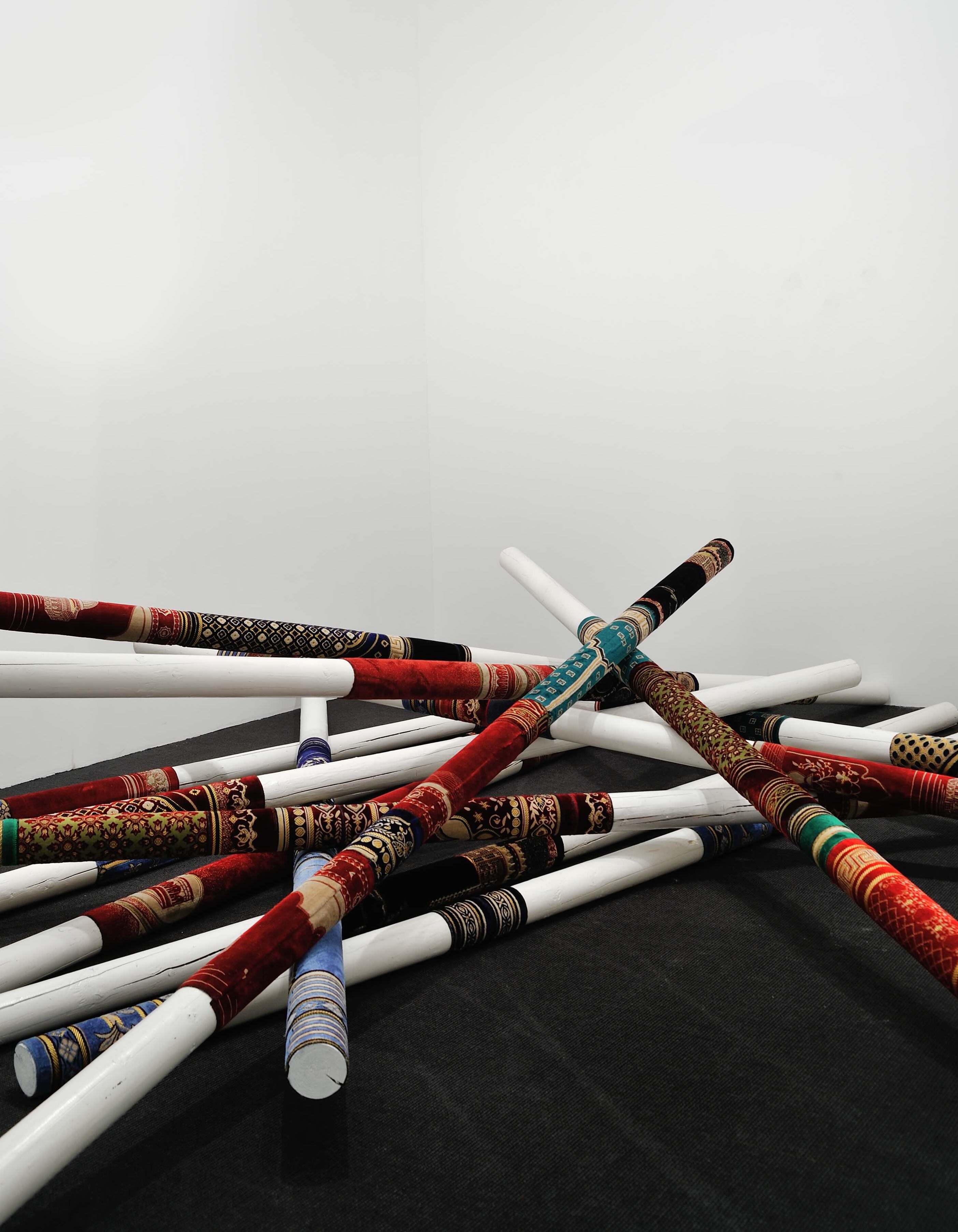 The installation is presented on the ground in organized chaos, showing an undeniable fall.