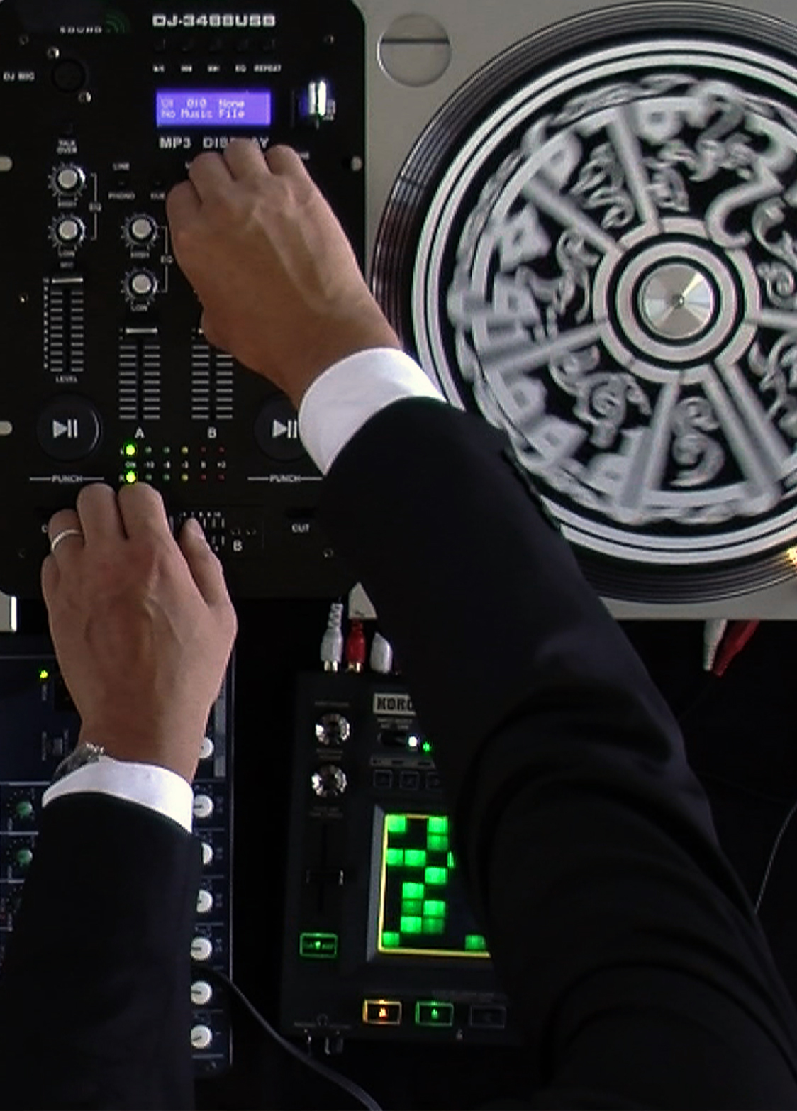 Mixology presents a close up of a DJ's mixing table. It is a familiar sight: two turntables separated by a mixing desk, with the arms of a DJ flipping switches and spinning records. But here, the black vinyl of the records is decorated with circular Hadit from the prophet, painted in white on the grooved surfaces.