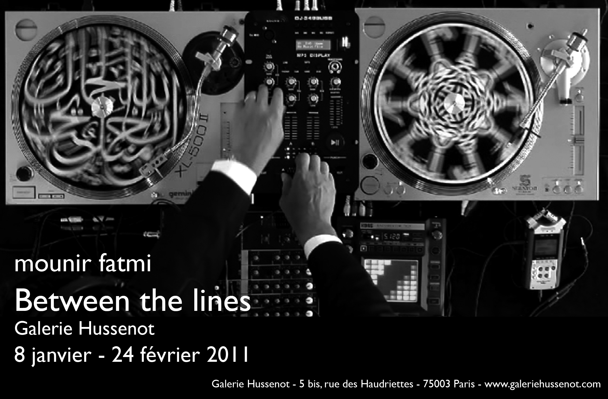 Like much of fatmi's work, Mixology juxtaposes the Occident with the Orient. This is reinforced by the predominantly black and white aesthetic, contrasting the white Arabic verses against the black of the vinyl and mixing table. The conceptual contrast, however, is far from black and white.