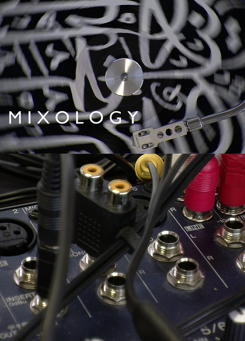 Mixology présente un gros plan de la table de mixage d'un DJ. C'est un spectacle familier : deux platines séparées par une console de mixage, avec les bras d'un DJ manipulant les commutateurs et faisant tourner des disques. Mais ici, le vinyle noir des disques est décoré avec des Hadiths du prophète circulaires, peints en blanc sur les surfaces rainurées.