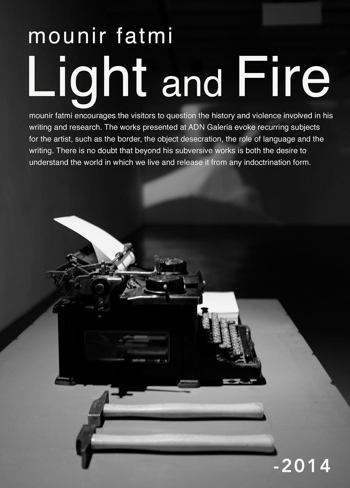 The simple and mundane gesture of striking the keys becomes crushing with the use of hammers. The weight that falls on the keys causes a deep, violent intonation. These effects, accentuated by the characteristic sound of a typewriter, also evoke the ticking of a clock or shots fired from a sub-machine gun. The time that passes and the history that escapes us is thus symbolized.