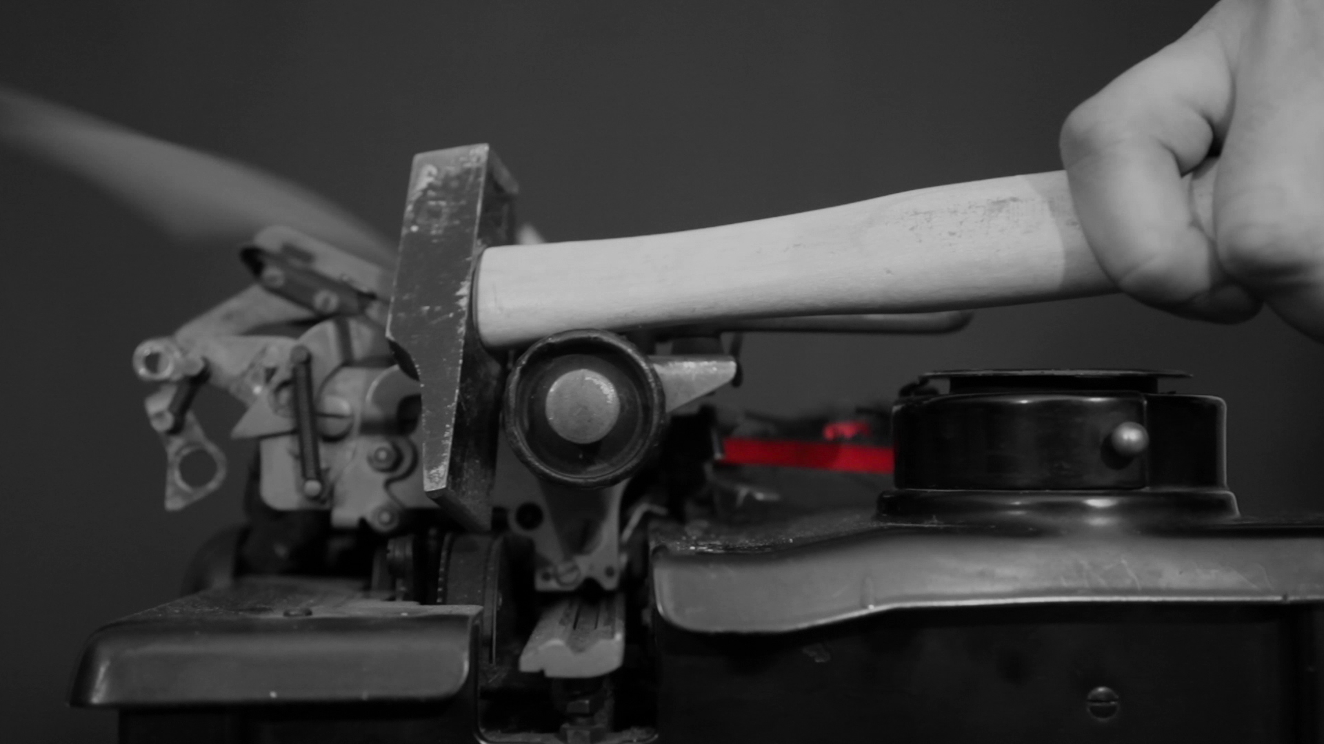 The black and white video depicts a man whose face remains concealed as he strikes a typewriter with two hammers. Only the typewriter’s ribbon bears a brilliant red the color of blood; a collision of the written sentence’s beauty and the violence and difficulty of its creation.