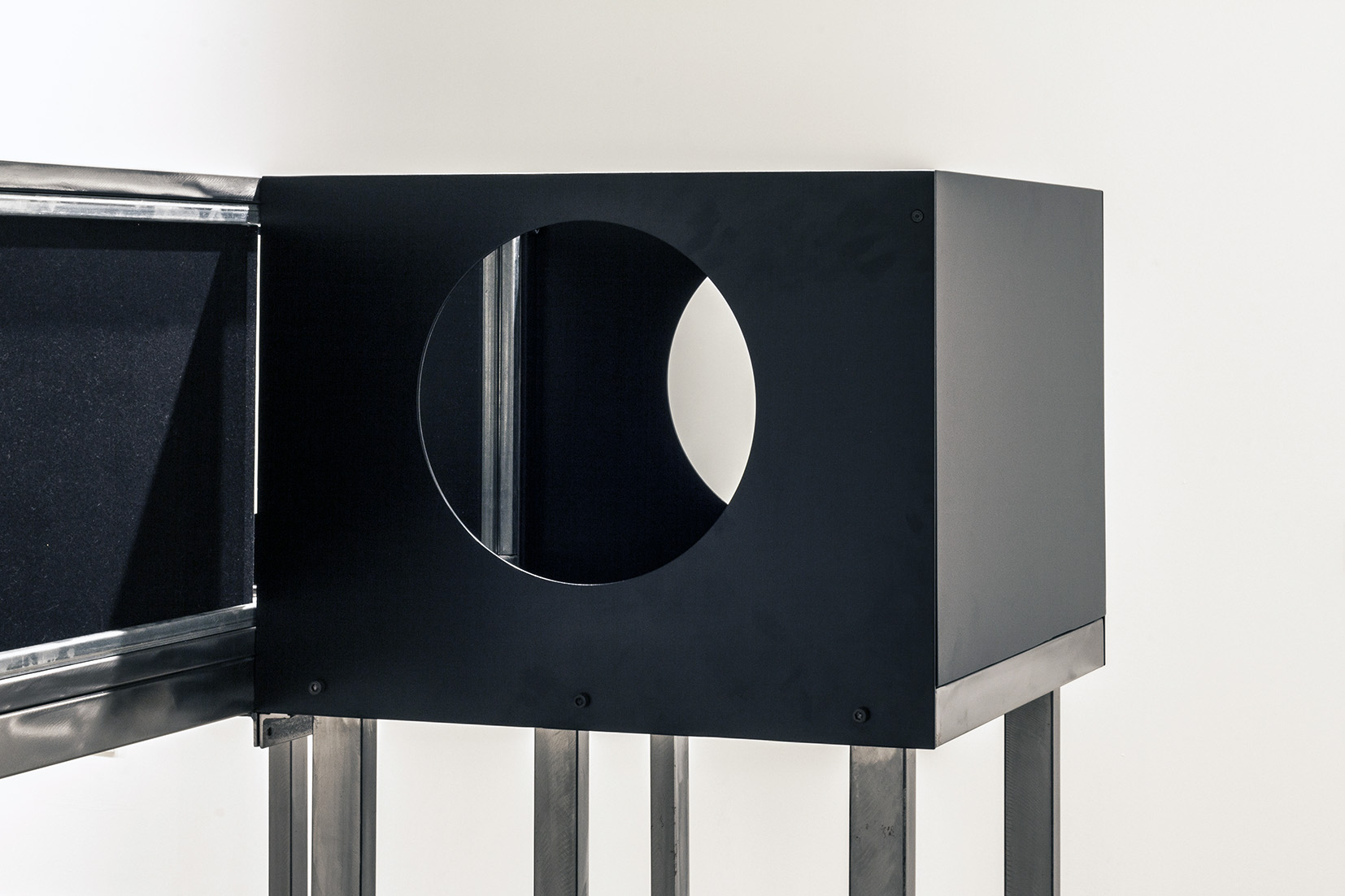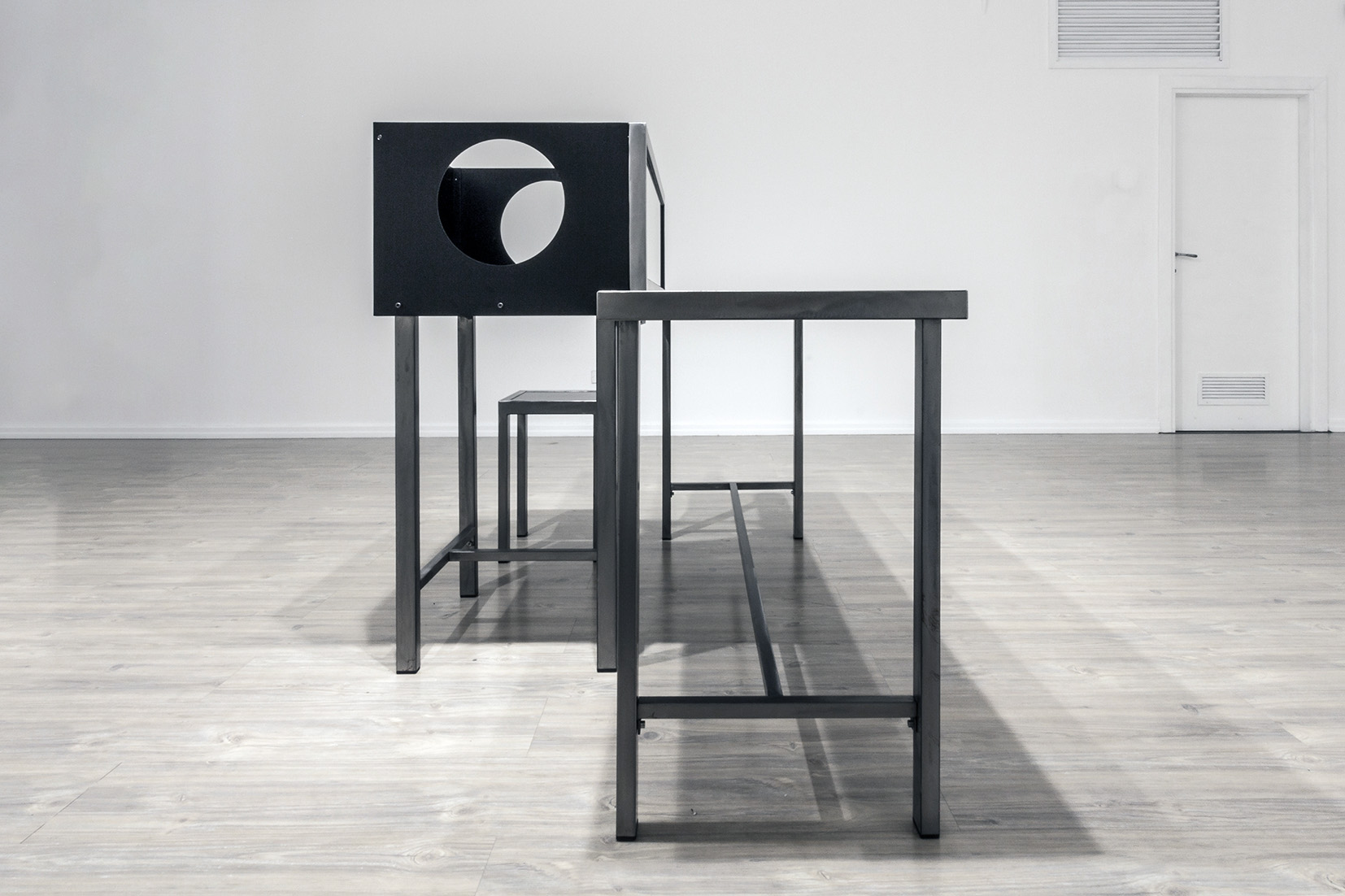 • 2014-2015, 150 x 45 x 75 et 50 x 50 x 75 cm,steel, mirror and wood.