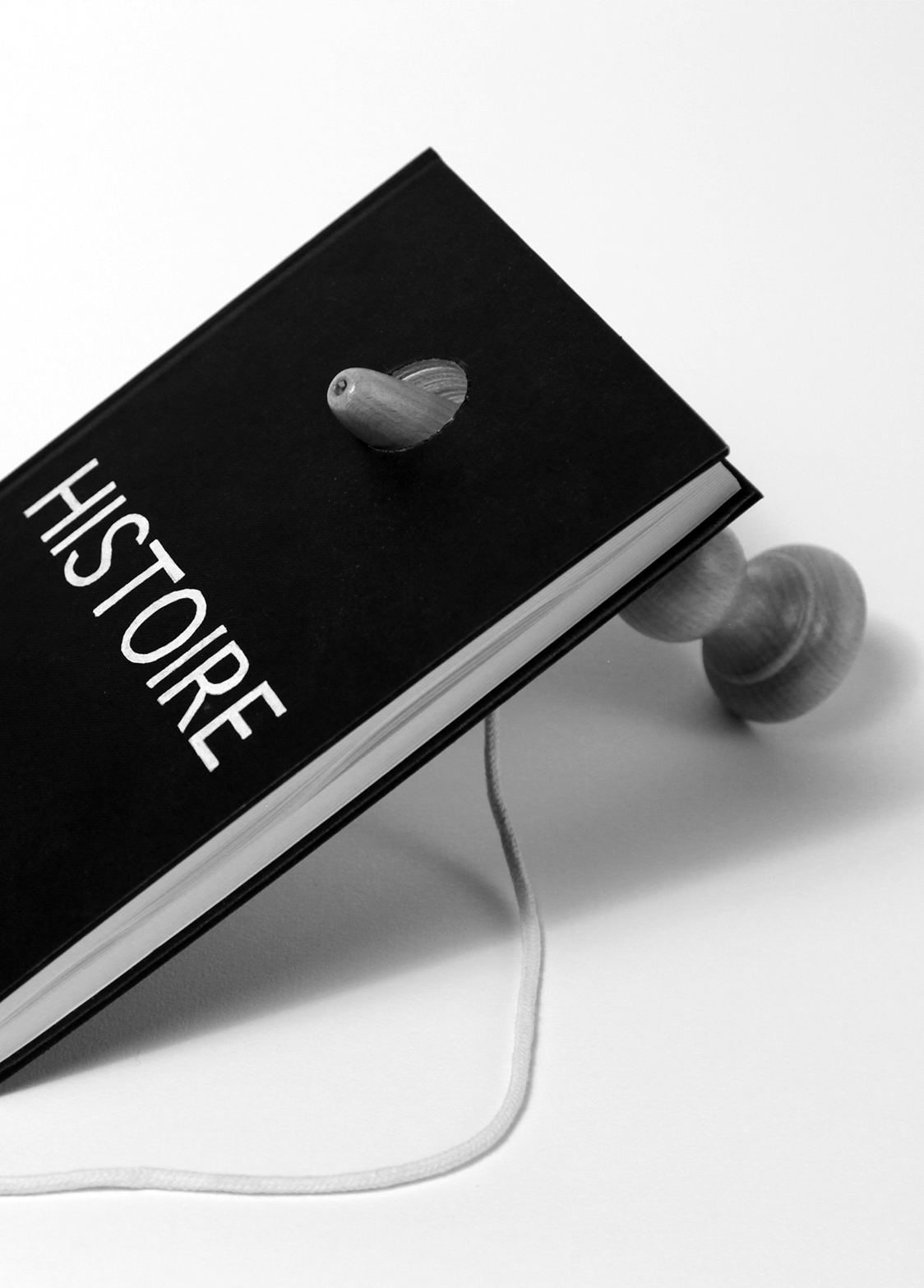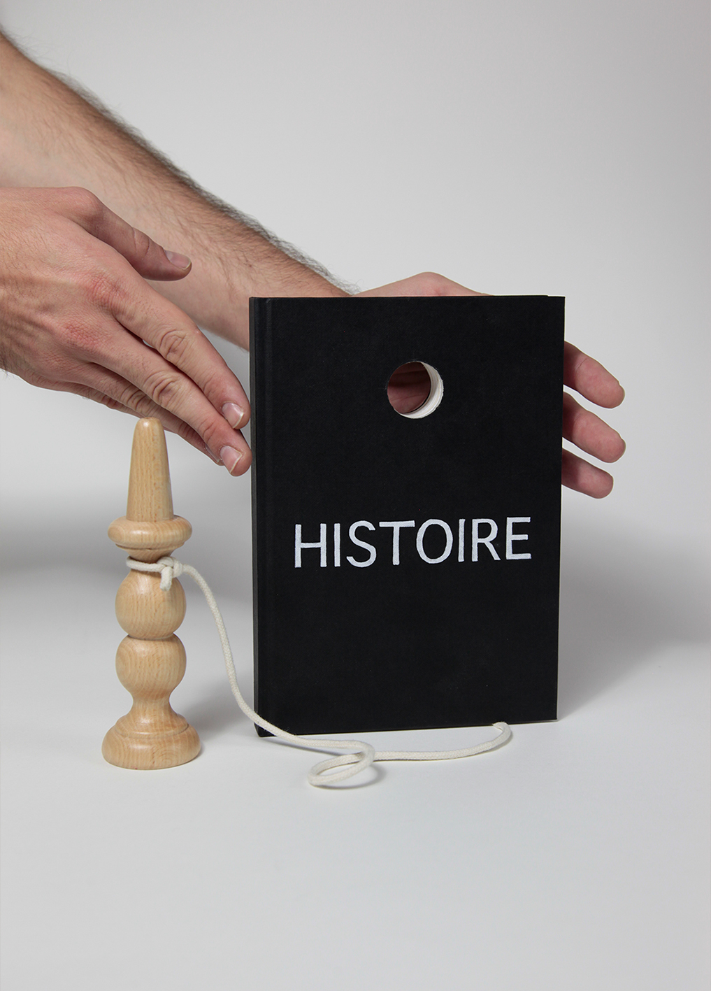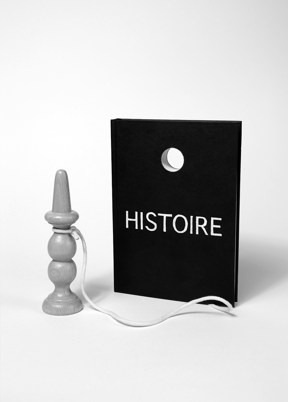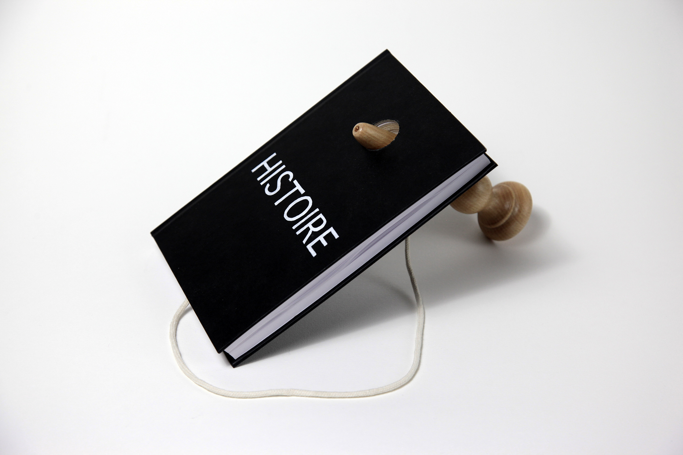 Without History is a photographic triptych created from an eponymous sculpture comprising the wooden stick of a cup-and-ball game attached by a string to a book with a black cover and a hole pierced through it, exhibiting a title in white capital letters: “HISTORY”. In one of the photographs, the stick and the book are next to one another, and in the two others, the stick has been stuck through the hole in the book.