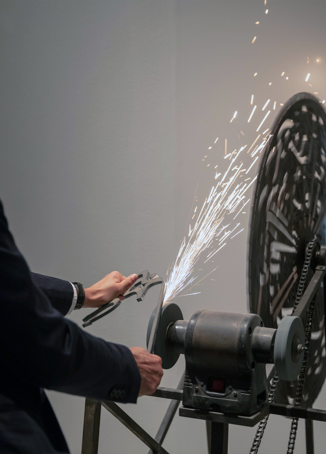 Finalement, l’œuvre ne prend réellement tout son sens qu’en présence et grâce à l’homme. En aiguisant ces bribes de calligraphies, l’œuvre exhorte à la prudence vis-à-vis des messages religieux. Le magnétisme produit par le mouvement de la machine et son esthétisme va de pair avec la menace latente qu’elle implique. Ainsi, la manière dont l’homme met en branle cette machine obsolète presque par automatisme, opère un renversement. L’homme devient alors la machine qu’il essaie d’activer.