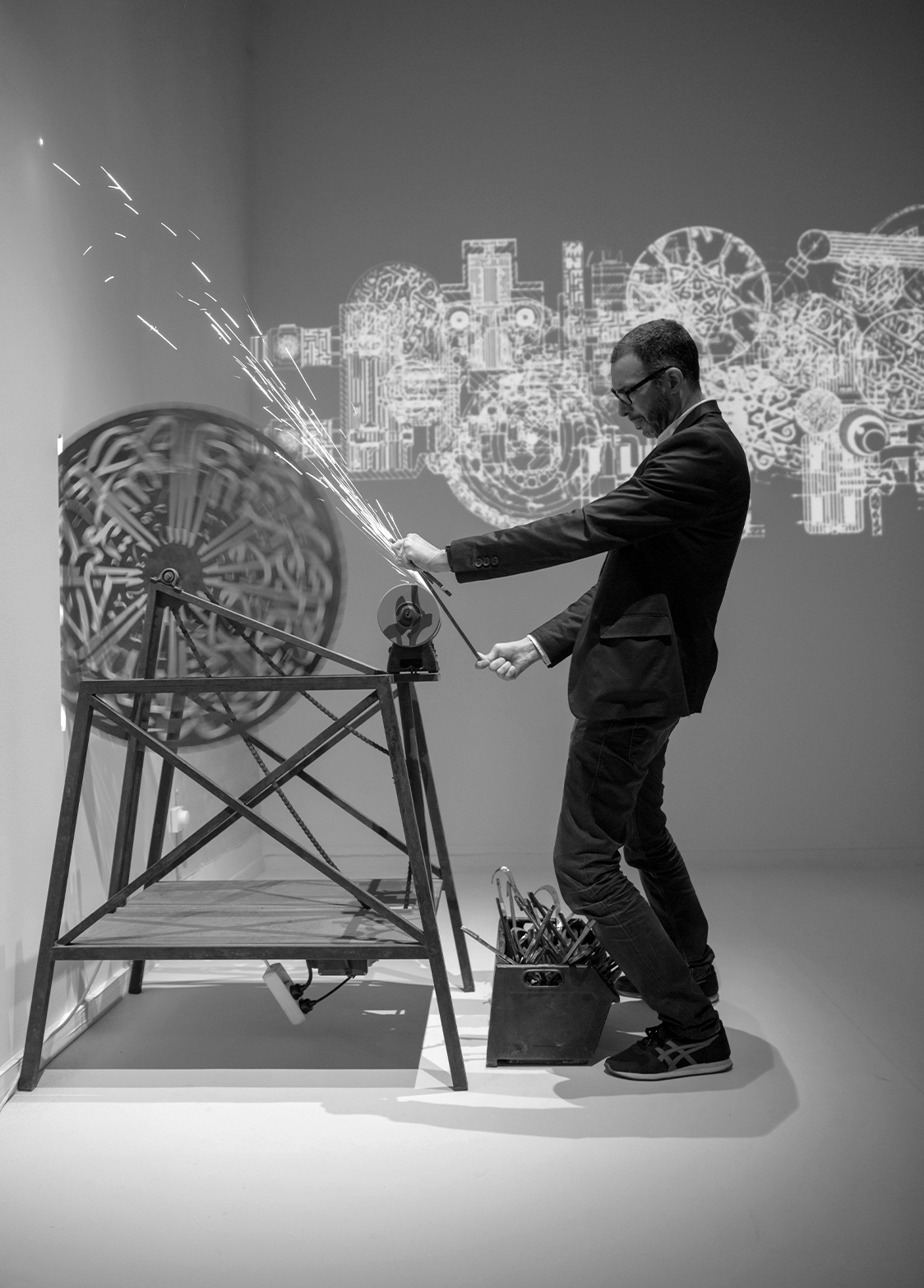 Shards of the same calligraphic verse are scattered around the machine, as if they had escaped from the surface of the blade. This effect is accentuated when the machine is set in motion by a performer, who tries to sharpen these pieces of text and continues to feed the machine. With this gesture, the man removes any religious value from the texts that are symbolized by this object.