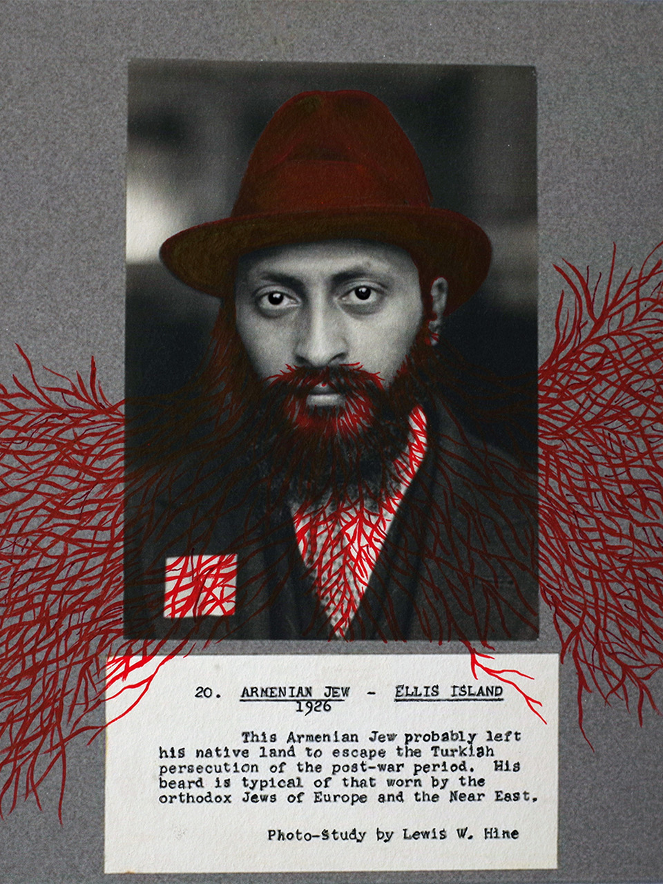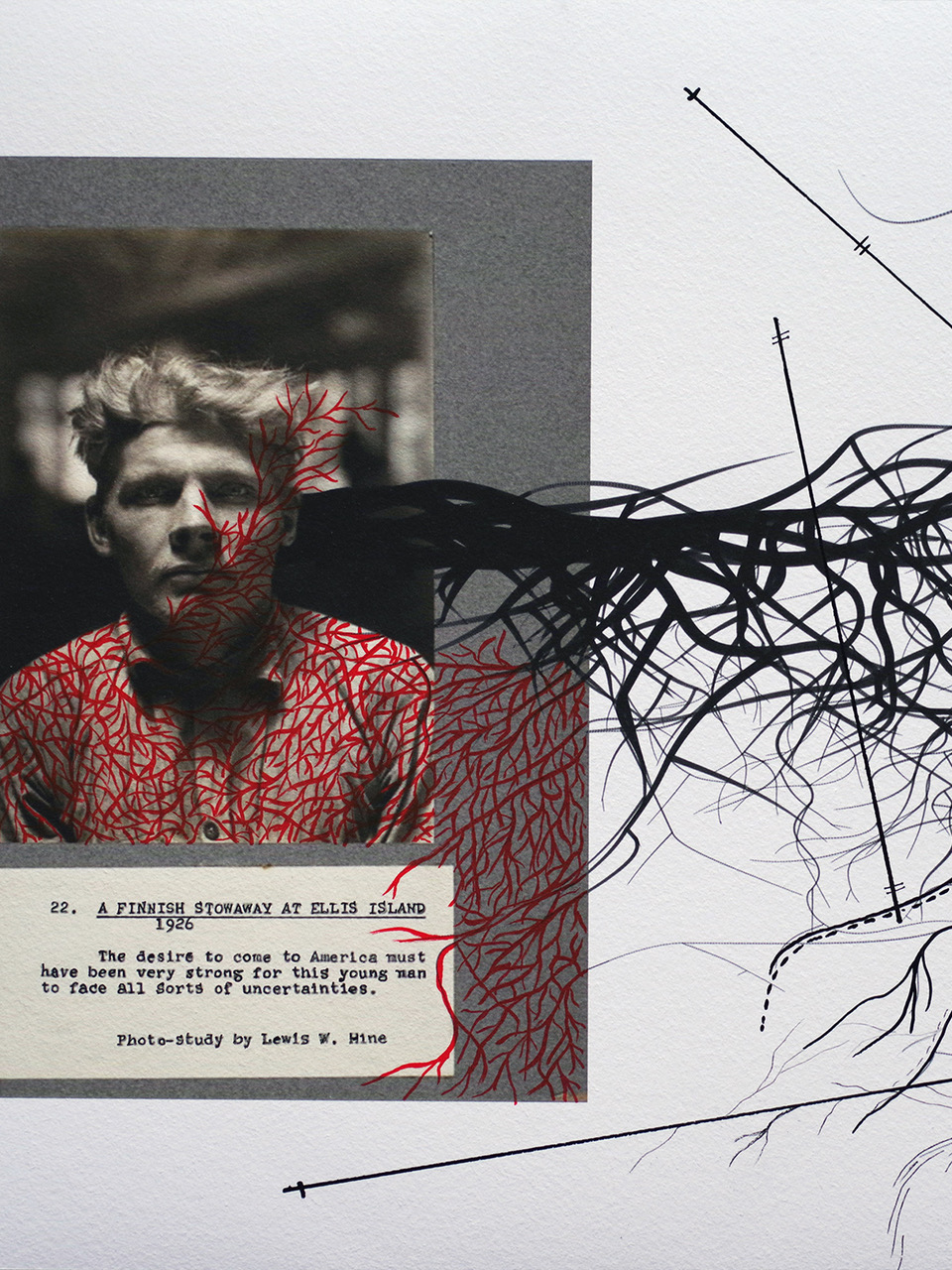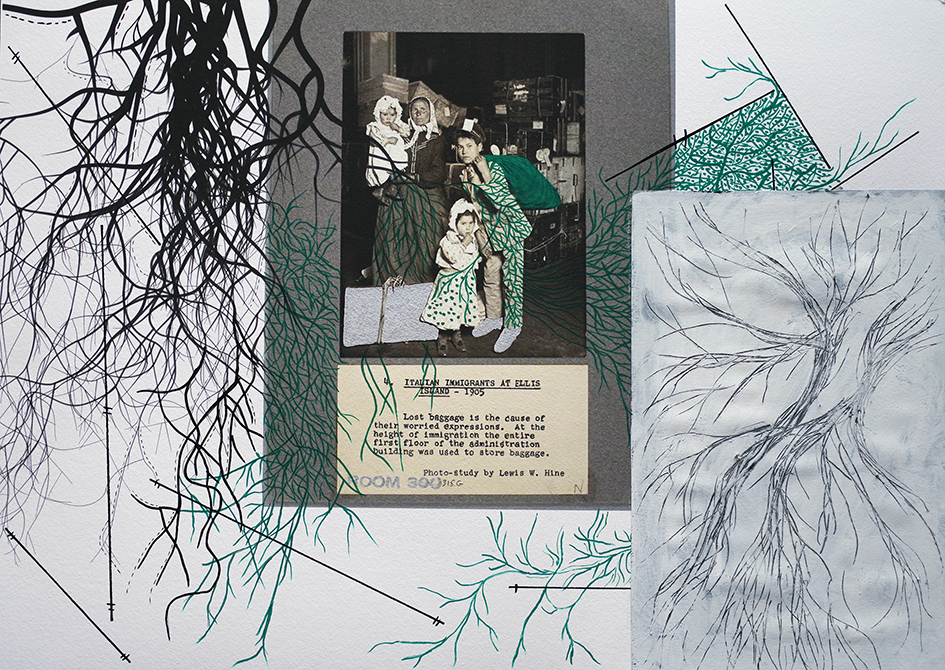 La série The Island of the Roots s’inscrit parfaitement dans cette double logique. À un moment de l’histoire où les États-Unis d’Amérique se ferment, refusent certains migrants, en chassent d’autres, mounir fatmi nous rappelle qu’au début du siècle dernier, et pendant longtemps, ces mêmes États-Unis furent une formidable terre d’accueil. Ellis Island fut ce passage obligé, cette porte d’entrée mythique où se scellaient tant d’espoirs de vie nouvelle. mounir fatmi alors se saisit de cette histoire et, selon une habitude qui lui est chère et qui constamment enrichit son travail et la portée de celui-ci, se réfère à un autre artiste qu’Ellis Island a inspiré, à savoir le célèbre photographe documentaire Lewis Hine, qui photographia, sur place, au début du 20ème siècle, tant d’immigrants différents, de la famille italienne au juif arménien, du jeune homme finlandais à la migrante syrienne – déjà – et tant d’autres. Partant de ces portraits, mounir fatmi leur dessine des racines. Ces racines qu’on arrache, et qui reviennent, complexifiées ; des racines végétales, dendritiques, sanguines parfois, transperçantes ; des racines qui vont d’un dessin à l’autre, qui s’embrassent et s’enlacent, comme Philémon et Baucis. Des racines d’échange et de partage. Des racines d’inclusion. De ces racines que l’on fait en marchant.
