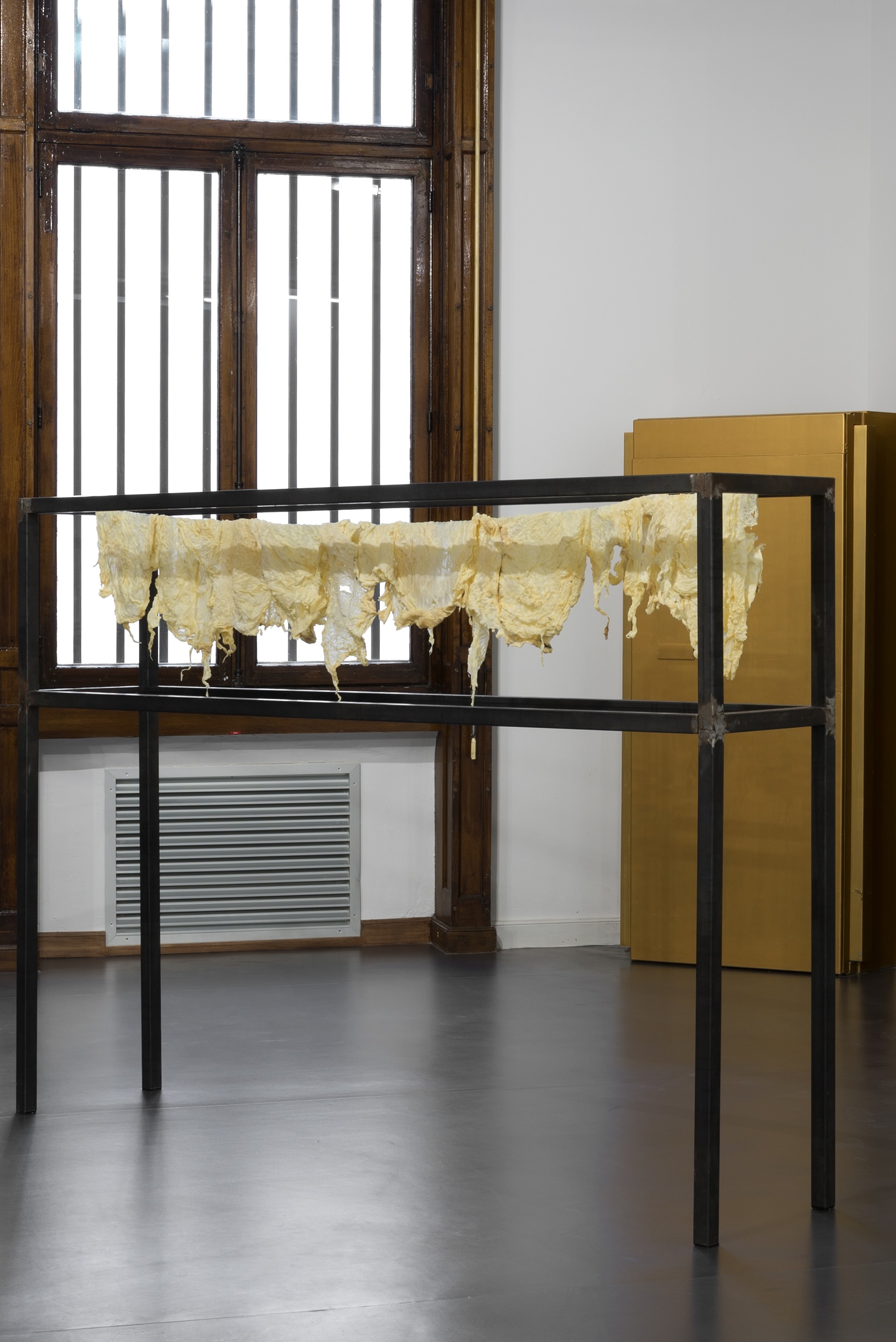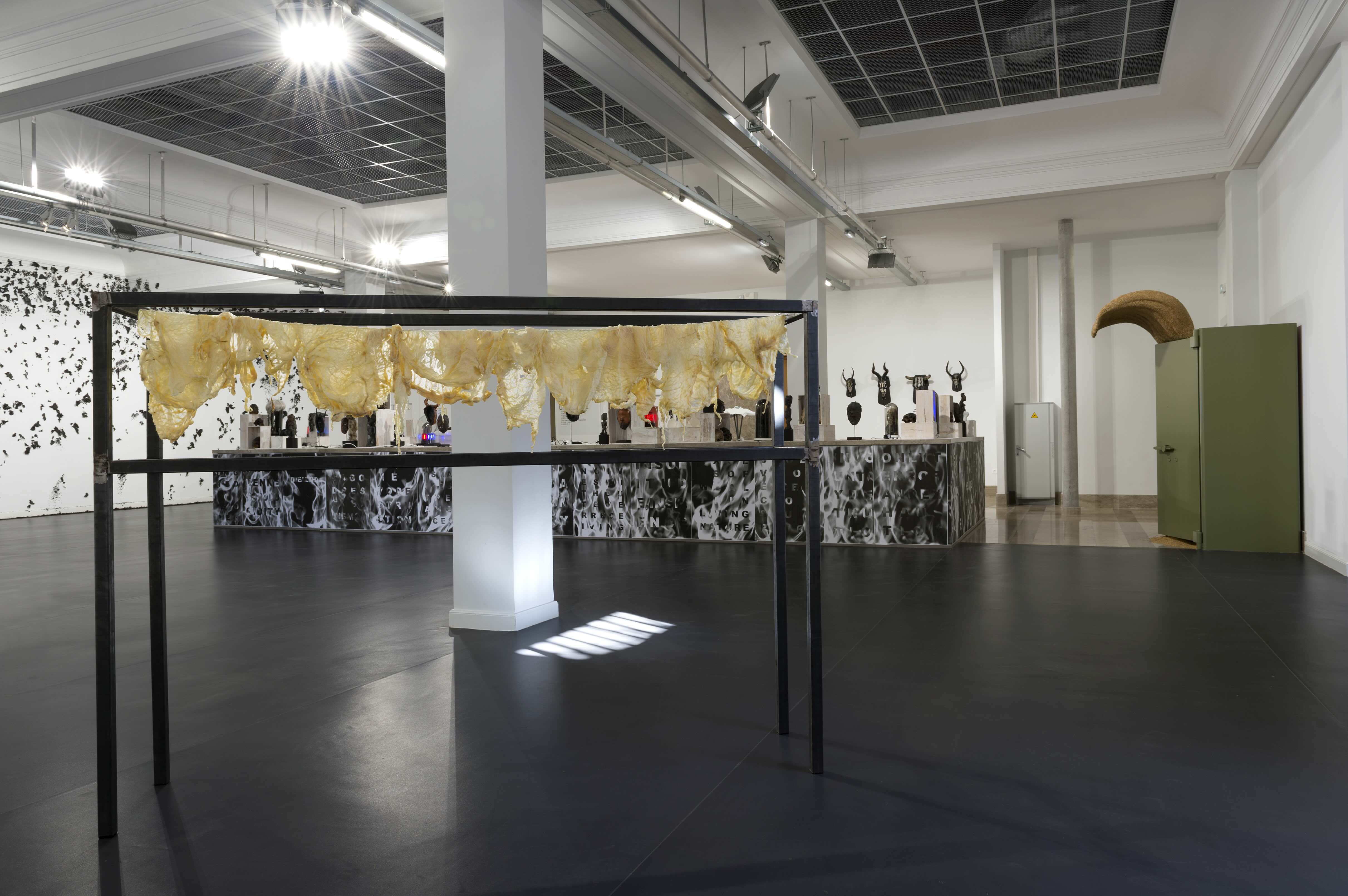 Far from a simple conceptual sample, we are faced with a piece that could not be more organic: the remaining parts of the sheep from the Muslim festival, the Aīd al-Kabīr, commemorating Abraham’s sacrifice. Only the dried fat slabs remain hanging on a wire, resuming the shape of the animal once all of the meat has been consumed, and it calls to mind the bovine spines adorning the walls of the Lascaux caves.