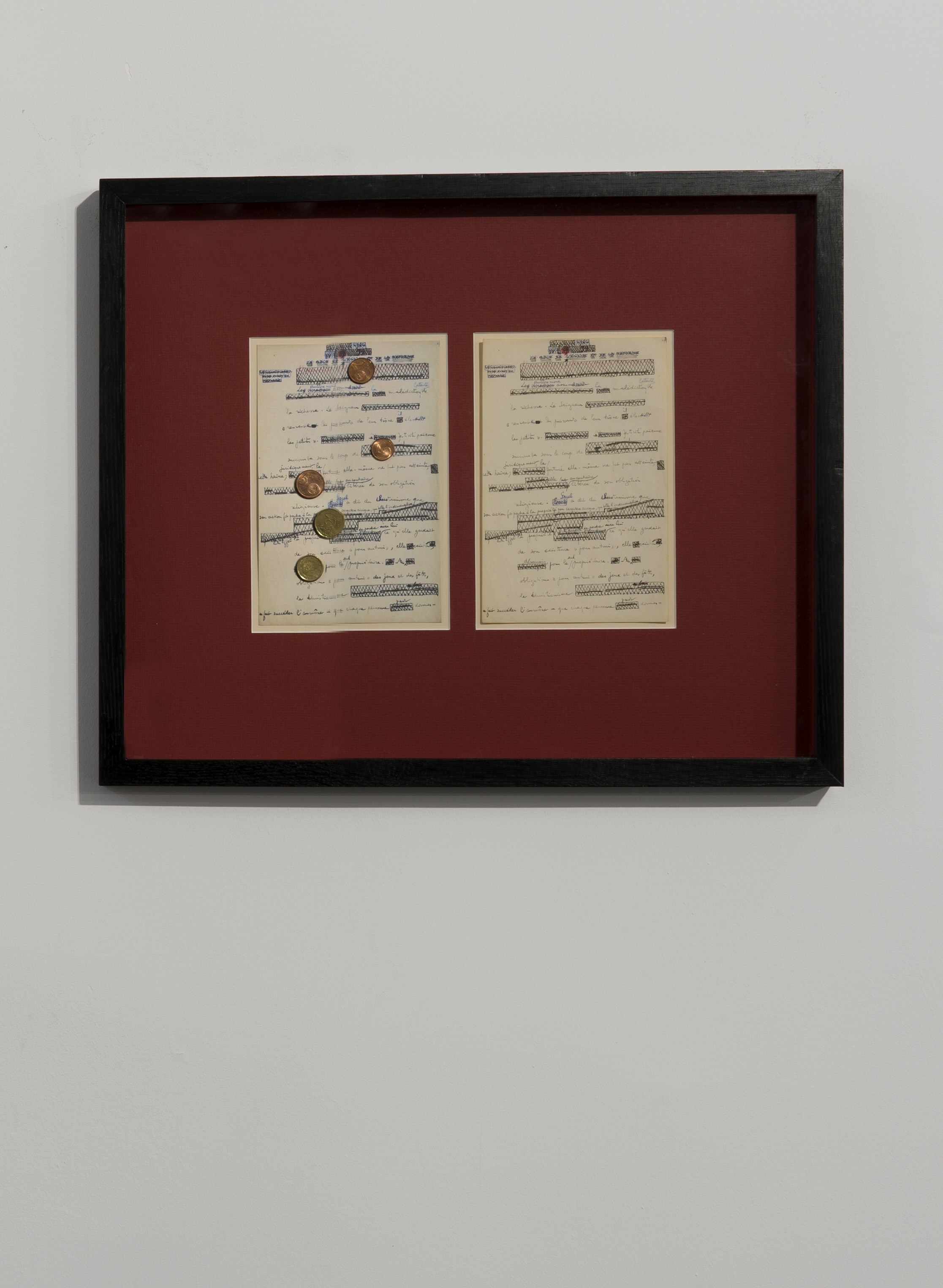 In April of 2016, mounir fatmi became the owner of an autographed draft of The Accursed Share. A yellowed text possessing a number of extremely carefully crossed-out lines, hatched drawings, and annotations by Georges Bataille. He explores the question of the market value of this vestige and its ironic ability to be exchanged for money; an incarnation of Marx’s study of commodity fetishism.
