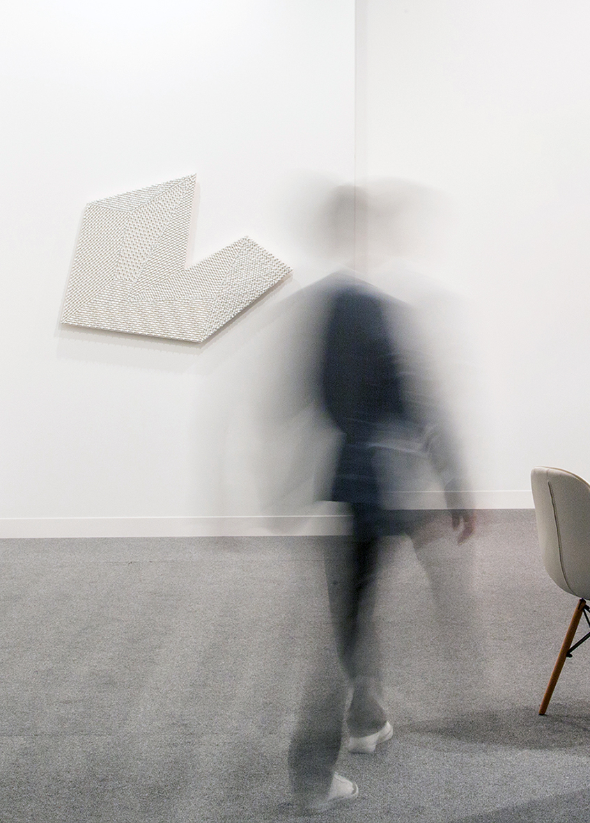 The sculptural setup combines the techniques of religious bas-relief and those of contemporary art, inspired by dripping and all-over. The multiplication of cables and geometric figures is seductive, yet it also verges on indistinctiveness and tends to create an effect of visual confusion and hypnosis in the viewer. An “esthetic trap” in Mounir Fatmi’s universe, the work calls for a visual meditation and an effort in discernment and to find the right distance of appreciation on the part of the viewer. It invites the viewer to apprehend the structures through a series of displacements and changes of perspective.