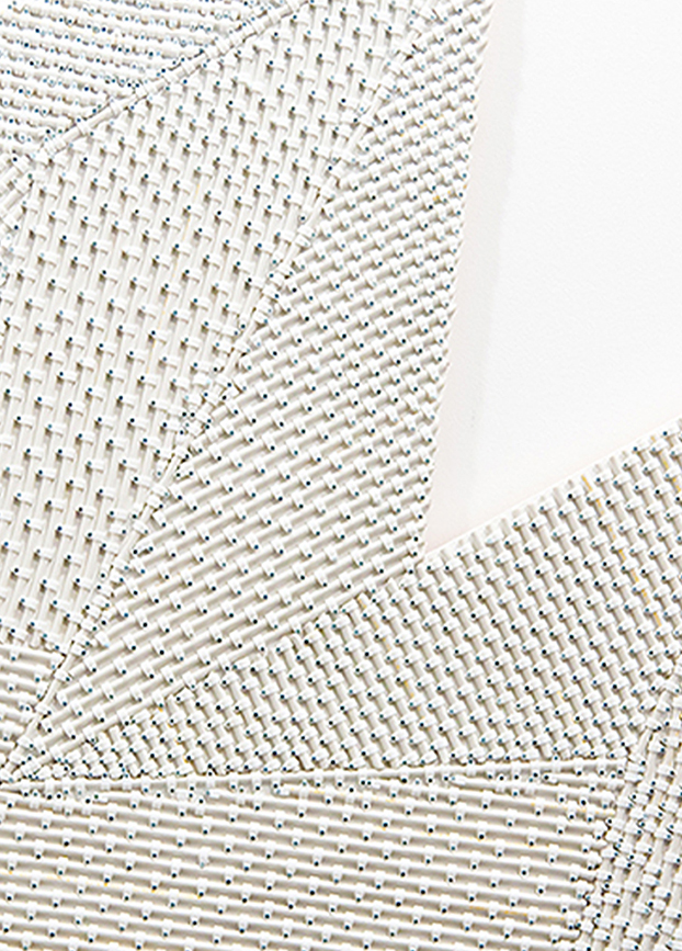 “The Flat Cube” is a bas-relief created with white coaxial cables assembled into various geometric figures that are joined together to form a polygon. A material for which Mounir Fatmi has a predilection, antenna cables are originally a tool for the transmission of images and information that played a part in the development of societies centered on media and communications. In Mounir Fatmi’s work, the cable is used as a means to study the relations between individuals and large-scale systems for the production and transmission of significations. This specific use of the material can be found in pieces such as “Al Jazeera”, “People Know, People Don’t Know” and “Who Needs a God Triangle?”, among others. The cube is also a recurrent geometric shape in the artist’s corpus, particularly in the video, sculpture and photography projects entitled “Brainteaser for Moderate Muslim”, in which the shape is part of an observation of the believer’s relation to objects of worship and religion.