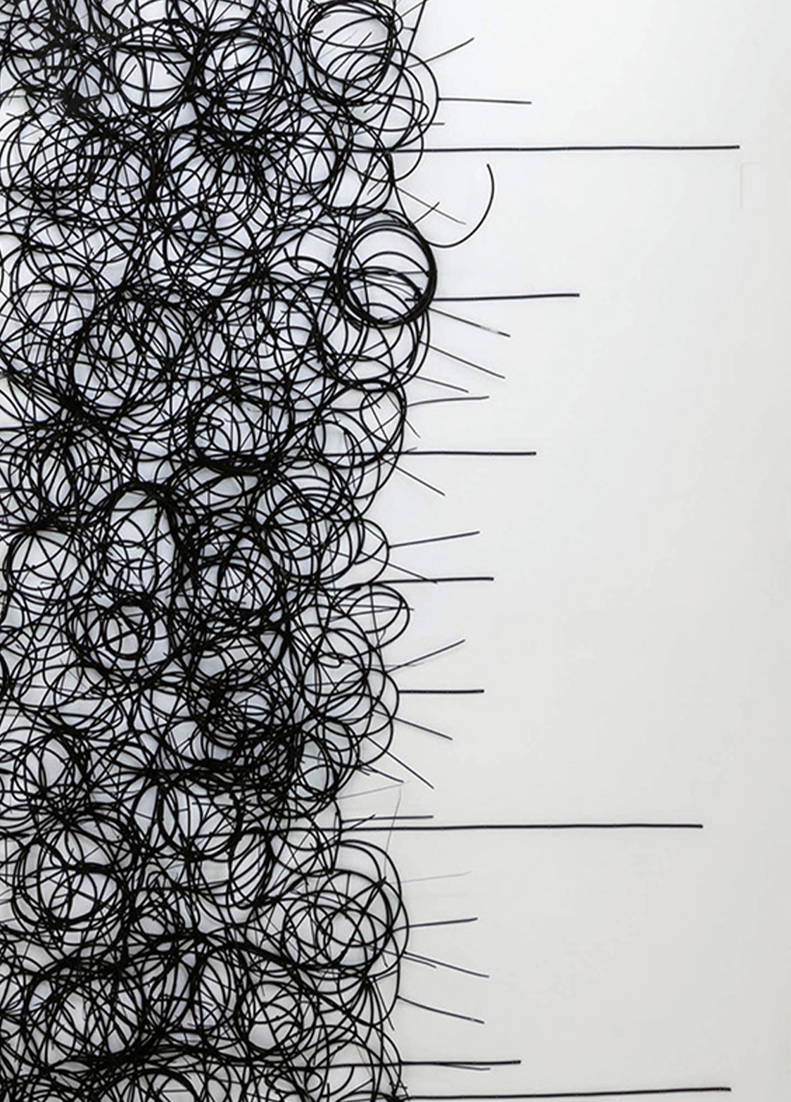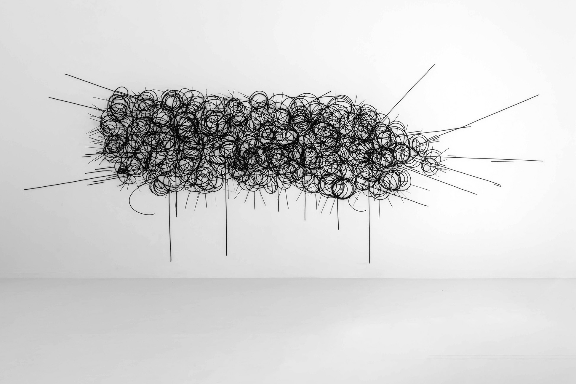 “My Cloudy Day” is the first of the artist’s sculptures that employs black coaxial cable – he started using this material in 1998. The piece places the viewer face to face with a large and complex mural sculpture consisting in intertwined coaxial cables fixed directly onto the white walls of the exhibit space with tacks. The cables twist into loops that superimpose on top of each other, or cross the composition in a straight line, in all directions. This material was originally used for the transmission of information and images. Frequent until the late 1990s, it has since become almost obsolete. As a motif highlighting connections and links, it enables the artist to question the foundation of our societies of information and communication and to study the relation of individuals to political powers and to history and general.