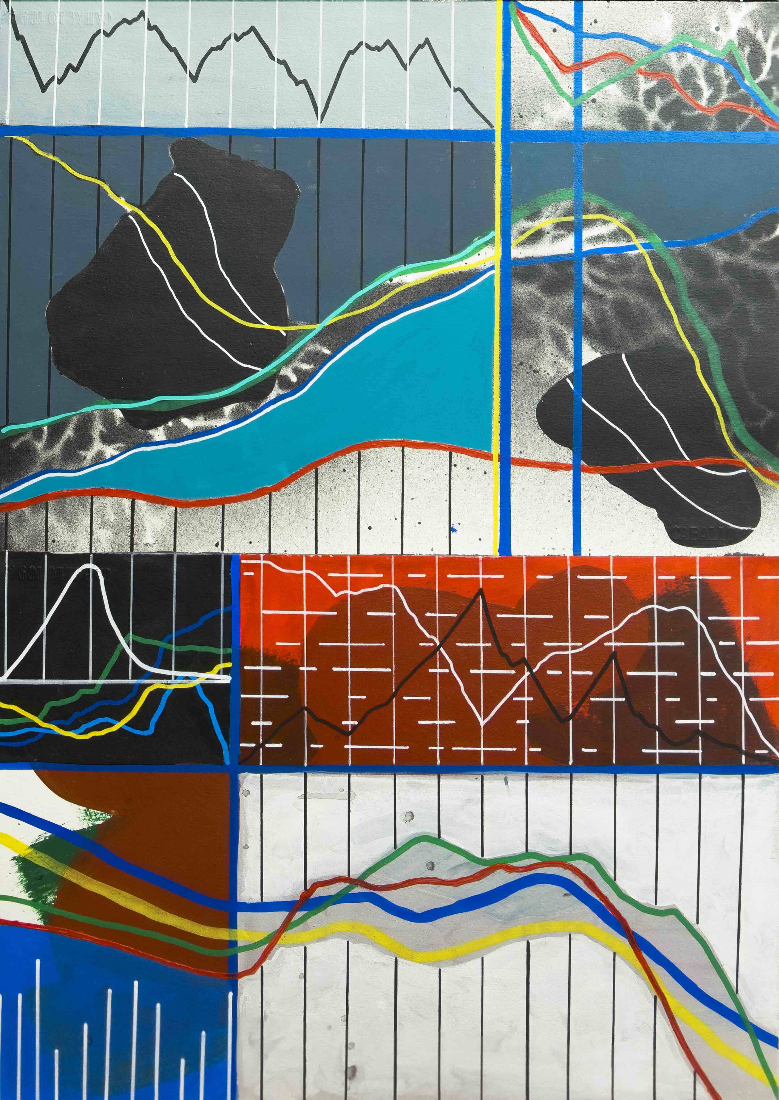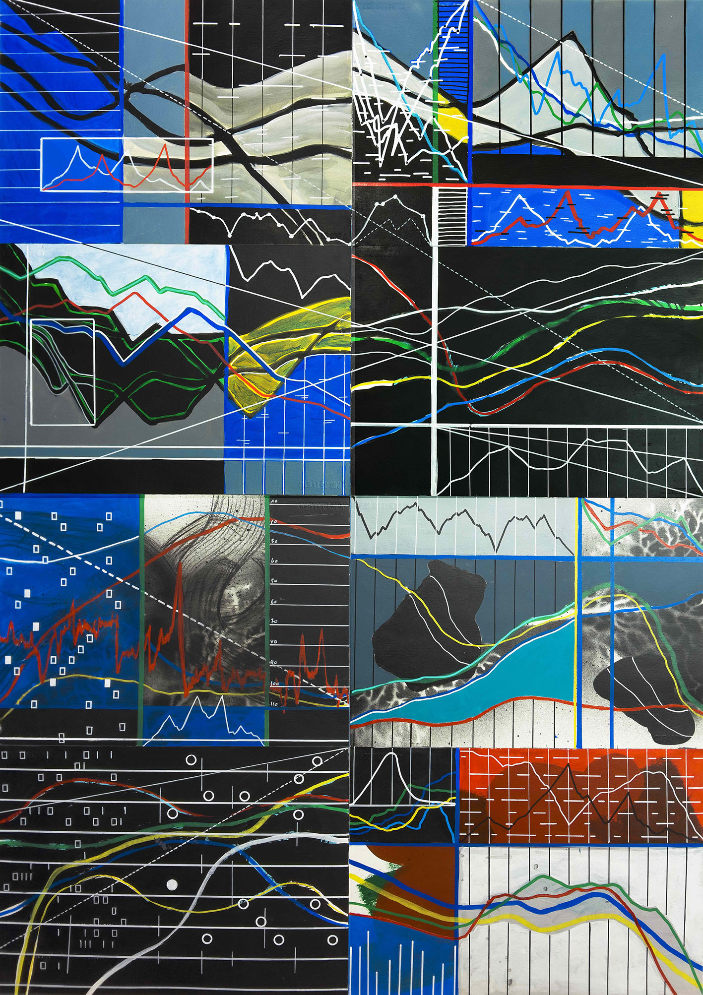 the artist took interest in the deconstruction of that language, but before anything, he needed to understand it. Which is why the simplest forms of graphic representations can be found in his paintings: the continuous curve, which represents the daily closing prices of a stock, connected together with a line.