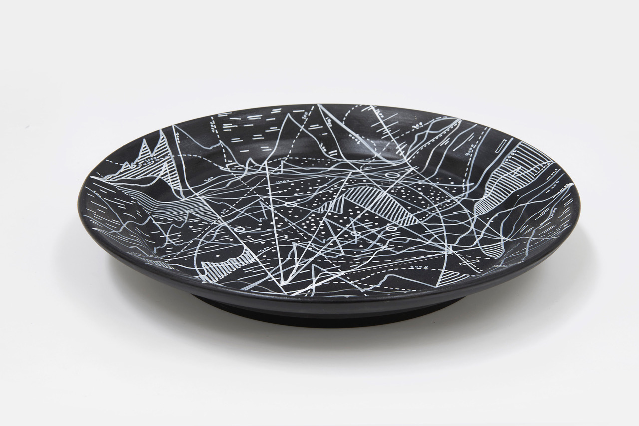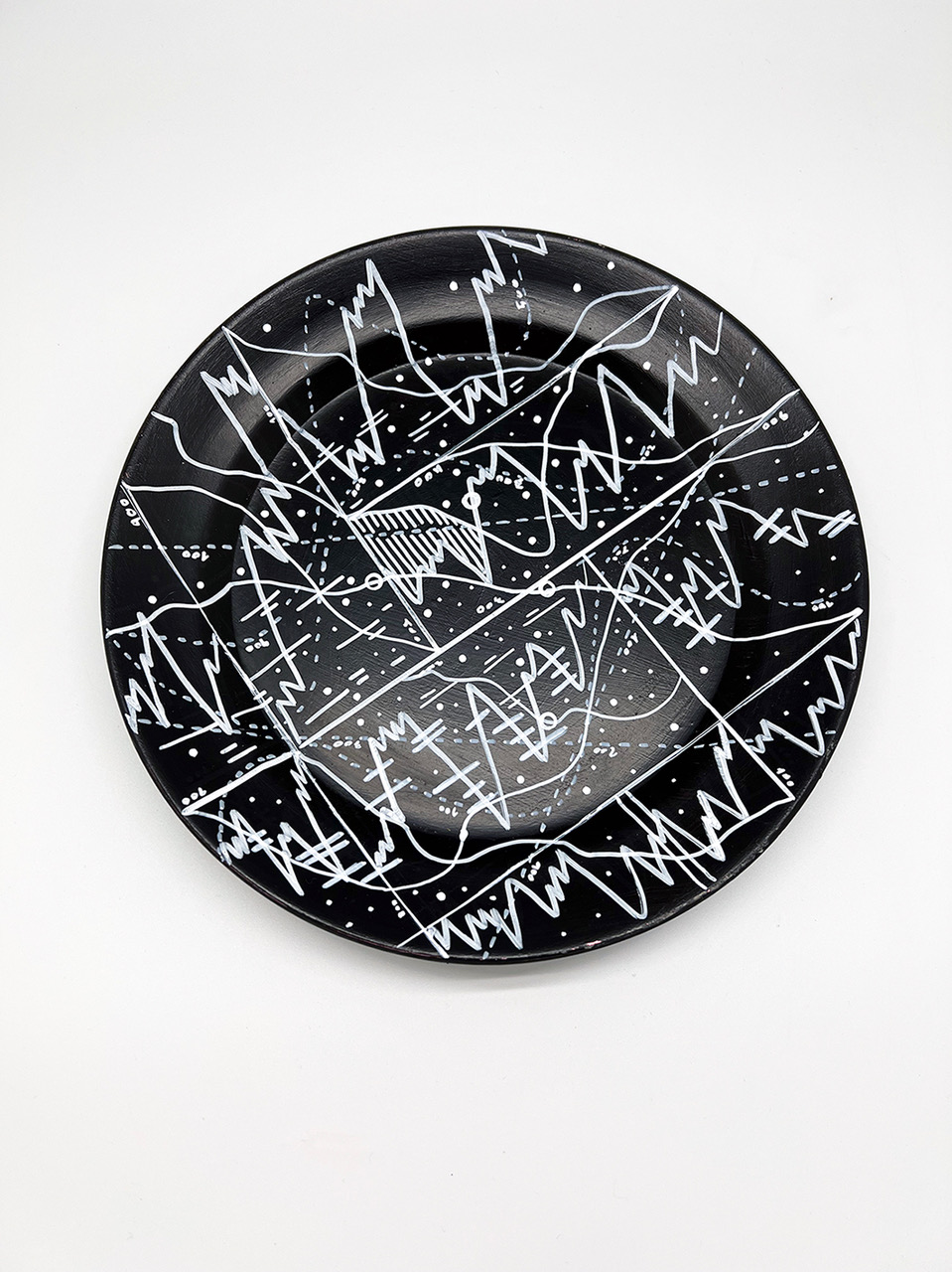 These ceramic sculptures function as artefacts or archives, loaded with information. They are crossed horizontally by lines of curved inflections and graphs resulting from mathematical algorithms and economic sciences to produce a visual representation of our numerical data. In other words, the artist links this mass of incomprehensible data to the reality of our daily lives. The jar, which represents one of the first supports for transporting and storing different liquids such as water, and the plate, which represents our relationship to food and therefore to the energy that allows us to continue living. Sculpture then brings together the concept of the medium and the archive at the same time.