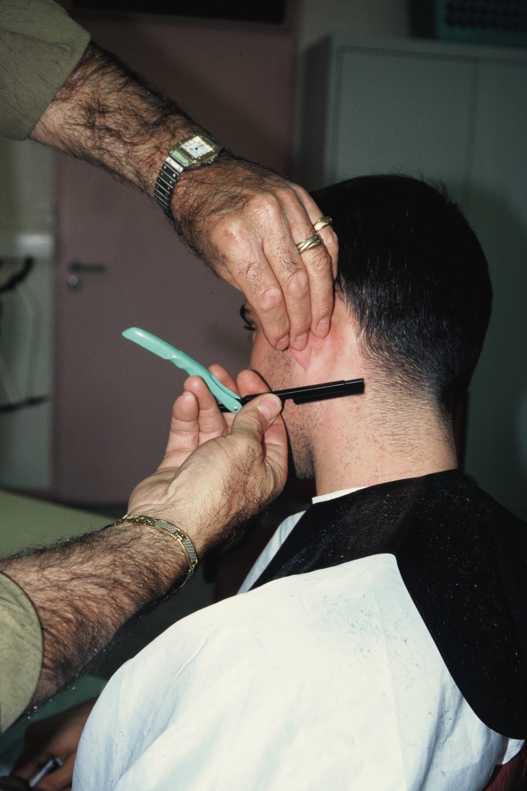 The 2008 photographic series « Square Cut » is set in a hair salon. It reproduces a classic scene that happens in every hair salon in the world: the customer in a seat while the hairdresser expertly cuts the hair. It thus offers to the viewer’s gaze various perspectives on customers’ heads, as they wear the traditional black hair salon blouse with its white collar. With a touch of irony, the composition shows an individual passively submitting to the manipulations of a figure of authority whose true identity remains mysterious. But the notion of danger isn’t absent from this scene, as it is discreetly alluded to through the presence in the images of the razor and the pair of scissors, a hairdresser’s essential tools, reminding us that the customer’s hands is temporarily between the hands of a competent authority.